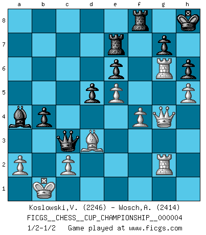 Last move : 1/2-1/2 2022 March 10 13:30:35 [Event "FICGS__CHESS__CUP_CHAMPIONSHIP__000004"] [Site "FICGS"] [Date "2021.09.20"] [Round "1"] [White "Koslowski,Volker"] [Black "Wosch,Arkadiusz"] [Result "1/2-1/2"] [WhiteElo "2246"] [BlackElo "2414"] 1.e4 c5 2.Nf3 Nc6 3.d4 cxd4 4.Nxd4 Nf6 5.Nc3 d6 6.Bg5 e6 7.Qd2 a6 8.O-O-O Bd7 9.Kb1 Be7 10.f3 b5 11.Nxc6 Bxc6 12.h4 Rc8 13.Ne2 O-O 14.Nd4 Bb7 15.g4 Nd7 16.Qh2 Ne5 17.Rg1 Qd7 18.Bxe7 Qxe7 19.g5 Nc6 20.Nxc6 Rxc6 21.f4 d5 22.e5 a5 23.h5 b4 24.g6 fxg6 25.Bb5 Rc7 26.Rxg6 Bc6 27.Bd3 Be8 28.Rg4 Kh8 29.Rdg1 Qc5 30.Qg3 Qa7 31.Rg5 h6 32.Rg6 Re7 33.b3 a4 34.bxa4 Bxa4 35.Rg2 Qc7 36.Qg4 Qc3 37.Qg3 Qc7 38.Qg4 Qc3 1/2-1/2 Sicilian defense Queenside Castling by player White (move 8) Kingside Castling by player Black (move 13) This chess game ended in a draw. Follow this game move after move (download)Play the opening like a book, the middle game like a magician, and the endgame like a machine. (Spielmann) Es ist besser die Steine des Gegners zu opfern. (Savielly Grigorievitsch Tartakower) El Ajedrez es un expediente tonto que hace creer a la gente inactiva que hacen una cosa muy astuta cuando solamente estan perdiendo su tiempo. (George Bernard Shaw) Shah mat. Le roi est mort. Cri de fierté d'un joueur venant de terrasser son adversaire, courtoisement, sans effusion de sang. The Internet is the world's largest library. It's just that all the books are on the floor. (John Allen Paulos)