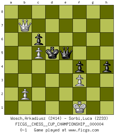 Last move : 0-1 2022 March 20 22:37:43 [Event "FICGS__CHESS__CUP_CHAMPIONSHIP__000004"] [Site "FICGS"] [Date "2021.09.20"] [Round "1"] [White "Wosch,Arkadiusz"] [Black "Sorbi,Luca"] [Result "0-1"] [WhiteElo "2414"] [BlackElo "2233"] 1.e4 e5 2.Nf3 Nc6 3.Bc4 Bc5 4.c3 Nf6 5.d3 a5 6.O-O d6 7.Bg5 h6 8.Bh4 Ba7 9.a4 g5 10.Bg3 Ne7 11.Re1 Ng6 12.d4 Qe7 13.h3 Nh7 14.Na3 h5 15.Kh1 g4 16.Ng1 Qf6 17.Bf1 Ng5 18.Nb5 Bb8 19.Na3 c6 20.Qd2 gxh3 21.gxh3 Bg4 22.Qe3 Nf3 23.Nxf3 Bxf3+ 24.Bg2 Bxg2+ 25.Kxg2 Rg8 26.Kf1 Bc7 27.Rad1 O-O-O 28.Qe2 exd4 29.Rxd4 h4 30.Bh2 Kb8 31.Nc4 Ne5 32.Bxe5 Qe6 33.Qf3 dxe5 34.Rxd8+ Rxd8 35.Ne3 Ka7 36.Rd1 Rxd1+ 37.Nxd1 Qc4+ 38.Ke1 Qxa4 39.Qg4 Bd8 40.Qf5 Qb5 41.Qxf7 Bg5 42.Qa2 Kb6 43.Qg8 Bf4 44.Qd8+ Kc5 45.f3 Bg3+ 46.Kd2 Bf4+ 47.Ke1 Kc4 48.Qg8+ Kd3 49.Qg2 Bg3+ 50.Kf1 Kc4 51.Qc2 Kc5 52.Kg2 a4 53.Nf2 Qc4 54.Nd3+ Kb5 55.Qd2 Qb3 56.Nc1 Qg8 57.Kf1 Qe6 58.Kg2 Qg8 59.Kf1 Qe6 60.Kg2 Bf4 61.Qe2+ Kb6 62.Nd3 Kc7 63.Nxf4 exf4 64.e5 Qg8+ 65.Kf1 Qd5 66.c4 Qd4 67.e6 Kd8 68.c5 Ke7 69.Qe1 Qd3+ 70.Kg2 Qg6+ 71.Kf1 Qg3 72.Qe4 Qxh3+ 73.Kg1 Qg3+ 74.Kf1 Qg5 75.Qxa4 Qe5 76.Qb4 Kxe6 77.Qxb7 Kd5 0-1 Giuoco Piano Kingside Castling by player White (move 6) Queenside Castling by player Black (move 27) 10 pieces endgame at move 77 : White KQPPP , Black KQPPP WHITE : King + 1 Queen 3 Pawns BLACK : King + 1 Queen 3 Pawns Player Black won this chess game. Follow this game move after move (download)The older I grow, the more I value Pawns. (Keres) Ich spiele 70 Eröffnungssysteme. (Viktor Kortschnoi) ¿Esta Bobby Fischer algo cuerdo?. (Salo Flohr) Les pièces de l'échiquier étaient impitoyables. Elles le retenaient, elles l'absorbaient. Il y avait de l'horreur en cela, mais aussi une harmonie unique. Car, qu'y a-t-il dans le monde, à part les échecs ? (V. Nabokov) When you stop learning you start dying. (Scott Adams)