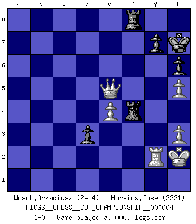 Last move : 1-0 2022 March 6 12:37:26 [Event "FICGS__CHESS__CUP_CHAMPIONSHIP__000004"] [Site "FICGS"] [Date "2021.09.20"] [Round "1"] [White "Wosch,Arkadiusz"] [Black "Moreira,Jose"] [Result "1-0"] [WhiteElo "2414"] [BlackElo "2221"] 1.e4 e5 2.Nf3 Nc6 3.Bc4 Nf6 4.d3 Bc5 5.c3 d6 6.O-O O-O 7.a4 a5 8.Re1 Be6 9.Bxe6 fxe6 10.Be3 b6 11.Na3 Bxa3 12.Rxa3 h6 13.Bd2 Nd7 14.b4 Qf6 15.Qe2 axb4 16.cxb4 Nd4 17.Nxd4 exd4 18.a5 c5 19.a6 b5 20.f4 e5 21.Rf1 Qd8 22.h3 exf4 23.Bxf4 cxb4 24.Rb3 Rxa6 25.Rxb4 Qh4 26.Kh2 Rxf4 27.g3 Rxf1 28.gxh4 Rf8 29.Rxb5 Ne5 30.Kg2 Rc6 31.Rb2 Rc3 32.Rd2 Rc7 33.Qd1 Rcf7 34.h5 Rf4 35.Qb3+ Kh7 36.Qd5 Nf3 37.Rb2 Ne1+ 38.Kh2 Nxd3 39.Re2 Ne5 40.Qxd6 d3 41.Rg2 Re8 42.Qd5 Ref8 43.Qxe5 1-0 Two knights defense (Modern Bishop's Opening) Kingside Castling by player White (move 6) Kingside Castling by player Black (move 6) Player White won this chess game. Follow this game move after move (download)Not only will I predict his triumph over Botvinnik, but I'll go further and say that he'll probably be the greatest Chess player that ever lived. (John Collins) Gott hat gewollt, dass ich Champion werde. (Surab Azmajparaschvili) Antes de los Finales, los dioses han colocado el Juego Medio. (Siegbert Tarrasch) Le moment que je préfère le plus dans une rencontre, c'est celui où je sens que la personnalité de l'adversaire se brise. (Robert Fischer) It's only after you lost everything, Tyler says, that you're free to do anything. (Chuck Palahniuk, Fight Club)