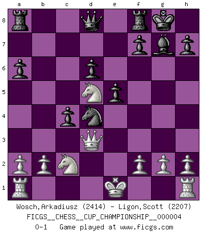 Last move : 0-1 2021 December 23 9:5:38 [Event "FICGS__CHESS__CUP_CHAMPIONSHIP__000004"] [Site "FICGS"] [Date "2021.09.20"] [Round "1"] [White "Wosch,Arkadiusz"] [Black "Ligon,Scott"] [Result "0-1"] [WhiteElo "2414"] [BlackElo "2207"] 1.e4 c5 2.Nf3 Nc6 3.d4 cxd4 4.Nxd4 Nf6 5.Nc3 e5 6.Ndb5 d6 7.Bg5 a6 8.Na3 b5 9.Bxf6 gxf6 10.Nd5 f5 11.exf5 Bxf5 12.c3 Bg7 13.Nc2 O-O 14.c4 Nd4 15.Bd3 Bxd3 16.Qxd3 bxc4 0-1 Sicilian : Pelikan (Lasker/Sveshnikov) variation Kingside Castling by player Black (move 13) Player Black won this chess game. Follow this game move after move (download)When I have White, I win because I am white; When I have Black, I win because I am Bogolyubov. (Bogolyubov) Nur ein wirklich starker Spieler weiß wie schwach er spielt. (Savielly Grigorievitsch Tartakower) Hay dos clases de hombres: aquellos que se conforman en dejarse llevar por las circunstancias y que juegan barajas y aquellos decididos a controlar las circunstancias y que juegan al Ajedrez. (Mortimer Collins) Les Echecs sont affaire de jugement sensible. Savoir quand frapper et quand esquiver. (Fischer) Tree pose grows confidence. It roots me to this world. (Terri Guillemets)