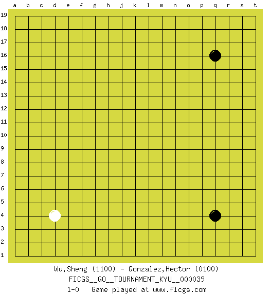 Last move : 1-0 2007 August 20 16:32:2 [Event "FICGS__GO__TOURNAMENT_KYU__000039"] [Site "FICGS"] [Date "2007.07.20"] [Round "1"] [Black "Wu,Sheng"] [White "Gonzalez,Hector"] [Result "1-0"] [Rating 1 "1100"] [Rating 2 "0100"] 1.q16 d4 2.q4 1-0 This go game has been lost on time (started : 2007.07.20 6:17:41) Here are the names of the openings (joseki) played in the four corners : Corner q4 : q4 1-0 Hoshi (Hwajeom, Seongjeom, Xingwei`) 4-4 Point. The star or hoshi (4-4) point, emphasizing influence at the potential expense of territory. Player Black won this Go (weiqi, baduk) game. Follow this game move after move (download)If a formation is symmetrical, play at the center. (Anonymous) All maxims have their antagonist maxims; proverbs should be sold in pairs, a single one being but a half truth. (William Mathews)
