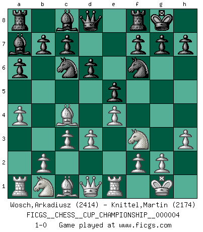 Last move : 1-0 2021 December 4 11:4:14 [Event "FICGS__CHESS__CUP_CHAMPIONSHIP__000004"] [Site "FICGS"] [Date "2021.09.20"] [Round "1"] [White "Wosch,Arkadiusz"] [Black "Knittel,Martin"] [Result "1-0"] [WhiteElo "2414"] [BlackElo "2174"] 1.e4 e5 2.Nf3 Nc6 3.Bc4 Bc5 4.c3 Nf6 5.d3 O-O 6.O-O d6 7.Re1 a6 8.a4 Ba7 9.h3 1-0 This chess game has been lost on time (started : 2021.09.20 1:58:51) Giuoco Piano Kingside Castling by player Black (move 5) Kingside Castling by player White (move 6) Player White won this chess game. Follow this game move after move (download)Only the player with the initiative has the right to attack. (Wilhelm Steinitz) Der Bart als Geschlechtszeichen mitten im Gesicht ist obszön. Daher gefällt er den Weibern. [Zugegeben, kein Schachzitat, aber unglaublich originell] (Arthur Schopenhauer) Me dio la sensación de como si yo estuviera jugando en contra del mismo Ajedrez. - al estar jugando en contra de Robert Fischer (Walter Shipman) Même un GMI sait rarement calculer sur plus de cinq coups une attaque à sacrifices. (Rudolf Spielmann) Patience, use the Force, think ! (Obi-Wan Kenobi in Star Wars ep.2)