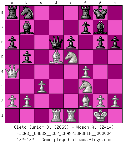 Last move : 1/2-1/2 2022 January 25 7:29:16 [Event "FICGS__CHESS__CUP_CHAMPIONSHIP__000004"] [Site "FICGS"] [Date "2021.09.20"] [Round "1"] [White "Cleto Junior,Dirceu"] [Black "Wosch,Arkadiusz"] [Result "1/2-1/2"] [WhiteElo "2063"] [BlackElo "2414"] 1.e4 c5 2.Nf3 Nc6 3.Bb5 g6 4.O-O Bg7 5.c3 Nf6 6.d4 Nxe4 7.d5 Nb8 8.Re1 Nf6 9.d6 e6 10.Bg5 b6 11.Ne5 Bb7 12.Nd2 h6 13.Bh4 O-O 14.f4 Qe8 15.Ndf3 Nd5 16.Qa4 Qc8 17.Rad1 c4 18.Bxd7 Qc5+ 19.Bf2 Qxd6 20.Bb5 a6 21.Bxc4 b5 22.Bxd5 1/2-1/2 Sicilian : Nimzovich-Rossolimo attack (with ...g6, without ...d6) Kingside Castling by player White (move 4) Kingside Castling by player Black (move 13) This chess game ended in a draw. Follow this game move after move (download)No price is too great for the scalp of the enemy King. (Koblentz) Gewinnen beim Schach fördert das Selbstvertrauen. Beim Sex spüre ich sowas nicht... (Garry Kasparov) Un jugador que trata de regresar una movida en el Ajedrez es un futuro carterista. (Richard Fenton) Les échecs sont plus proches de l'art de l'assassinat que de l'art de la guerre. (Arturo Perez-Reverte) Wawaweewa ! (Borat: Cultural learnings of America for make benefit glorious nation of Kazakhstan)