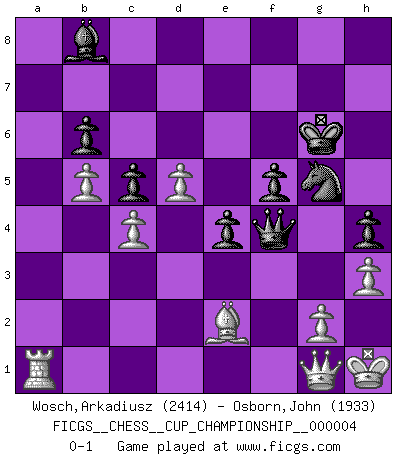 Last move : 0-1 2022 March 20 22:37:23 [Event "FICGS__CHESS__CUP_CHAMPIONSHIP__000004"] [Site "FICGS"] [Date "2021.09.20"] [Round "1"] [White "Wosch,Arkadiusz"] [Black "Osborn,John"] [Result "0-1"] [WhiteElo "2414"] [BlackElo "1933"] 1.e4 e5 2.Nf3 Nf6 3.Nxe5 d6 4.Nf3 Nxe4 5.d4 d5 6.Bd3 Nc6 7.O-O Be7 8.c4 Nb4 9.Be2 O-O 10.Nc3 Be6 11.Ne5 c5 12.Nxe4 dxe4 13.d5 Bc8 14.a3 Na6 15.f3 Bd6 16.f4 Nc7 17.b3 f6 18.Ng4 Bxg4 19.Bxg4 f5 20.Be2 g6 21.Bb2 Ne8 22.Qd2 h5 23.Qe3 b6 24.h3 Rf7 25.Bc3 Rh7 26.b4 h4 27.Be5 Qe7 28.Rab1 Rc8 29.Bc3 Nf6 30.b5 Rg7 31.a4 Rf8 32.a5 g5 33.fxg5 Nh7 34.Bxg7 Kxg7 35.axb6 axb6 36.Rb3 Qe5 37.Qc3 Qd4+ 38.Kh1 Kg6 39.Qa1 Qd2 40.Rf2 Qxg5 41.Rf1 Qe7 42.Ra3 Bb8 43.Rd1 Nf6 44.Rf1 Rg8 45.Rf2 Bg3 46.Rf1 Bb8 47.Rf2 Bg3 48.Rf1 Bc7 49.Rf2 Rg7 50.Qg1 Qe5 51.Rb3 Kh6 52.Rf1 Rg5 53.Ra3 Rg7 54.Ra7 Bb8 55.Ra6 Rb7 56.Ra8 Kg6 57.Ra3 Re7 58.Ra6 Bc7 59.Rfa1 Re8 60.Rd1 Qd6 61.Ra7 Bb8 62.Ra3 Rg8 63.Rf1 Qe5 64.Ra6 Bc7 65.Ra7 Bd6 66.Ra6 Rb8 67.Rfa1 Nh7 68.Rb1 Ng5 69.Rba1 Qf4 70.R6a3 Rf8 71.Ra7 Be5 72.Re7 Bd6 73.Rd7 Qg3 74.Ra3 Qf4 75.Rb7 Rb8 76.Rd7 Be5 77.Re7 Bf6 78.Rea7 Be5 79.Re7 Bd6 80.Rd7 Bc7 81.Ra1 Be5 82.Rda7 Re8 83.Rb7 Rb8 84.Rxb8 Bxb8 0-1 Petrov : Classical attack Kingside Castling by player White (move 7) Kingside Castling by player Black (move 9) Player Black won this chess game. Follow this game move after move (download)When the Chess game is over, the Pawn and the King go back to the same box. (Irish saying) Ich bewundere Kasparows phantasievolle Angriffssiege aus den Achtzigern und Neunzigern, aber wenn man sie mit dem Computer überprüft, nimmt der Computer in jeder zweiten Partie die Opfer an, verteidigt sich und gewinnt. (Vladimir Kramnik) Repentinamente, me resultaba obvio en mi analisis que yo había pasado por alto lo que Fischer había visto en el tablero con la mas grande facilidad. (Mikhail Botvinnik) Je ne suis pas le dernier à jouer lâchement des coups douteux pendant le zeïtnot de l'adversaire pour l'achever: en effet les coups qui font le plus peur sont ceux que l'on ne comprend pas. Je me fais souvent peur quand je joue. (Un professeur anonyme) Life is like a game of cards: the hand you are dealt represents determinism; the way you play it is free will. (Jawaharlal Nehru)