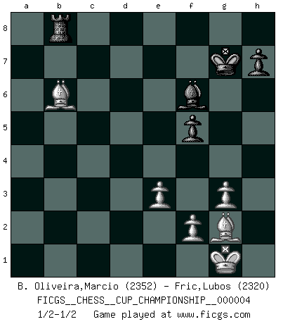 Last move : 1/2-1/2 2021 December 28 21:44:28 [Event "FICGS__CHESS__CUP_CHAMPIONSHIP__000004"] [Site "FICGS"] [Date "2021.09.20"] [Round "1"] [White "B. Oliveira,Marcio"] [Black "Fric,Lubos"] [Result "1/2-1/2"] [WhiteElo "2352"] [BlackElo "2320"] 1.c4 e5 2.g3 Nf6 3.Bg2 d5 4.cxd5 Nxd5 5.Nc3 Nb6 6.Nf3 Nc6 7.O-O Be7 8.a3 O-O 9.b4 Be6 10.Rb1 f6 11.d3 a5 12.b5 Nd4 13.Nd2 Qc8 14.e3 Nf5 15.Bb2 a4 16.Qc2 Nd6 17.Nde4 Nf7 18.Rfe1 Kh8 19.Qe2 Bg4 20.Qf1 Be6 21.Rbc1 Qd7 22.Nb1 Qxb5 23.Rxc7 Rae8 24.Nbc3 Qa5 25.d4 f5 26.Nc5 Bc4 27.Nxb7 Qa6 28.Rxc4 Qxc4 29.dxe5 Qxf1+ 30.Rxf1 Nc4 31.Ba1 Nfxe5 32.Nxa4 Bxa3 33.Rd1 Rc8 34.Nb6 Nxb6 35.Bxe5 Rc1 36.Rxc1 Bxc1 37.Bd4 Nd7 38.h4 Ba3 39.h5 Be7 40.h6 Bf6 41.hxg7+ Kxg7 42.Nc5 Nxc5 43.Bxc5 Rc8 44.Bb6 Rb8 1/2-1/2 English Opening Kingside Castling by player White (move 7) Kingside Castling by player Black (move 8) This chess game ended in a draw. Follow this game move after move (download)The way he plays Chess demonstrates a man's whole nature. (Stanley Ellin) Man braucht nicht immer den besten Zug zu spielen: Ein Zug muß aktiv, unternehmungslustig, korrekt und schön sein. (David Bronstein) Una partida de Ajedrez se divide en 3 etapas: la primera cuando piensas que tienes la ventaja, la segunda cuando crees que tienes la ventaja y la tercera... ¡cuando te das cuenta que vas a perder!. (Savielly Tartakower) Aux échecs, l'amour-propre est satisfait quand on remporte la victoire, mais il n'y a pas de honte à être battu. (Benjamin Franklin) Wisdom is the reward you get for a lifetime of listening when you'd have preferred to talk. (Doug Larson)
