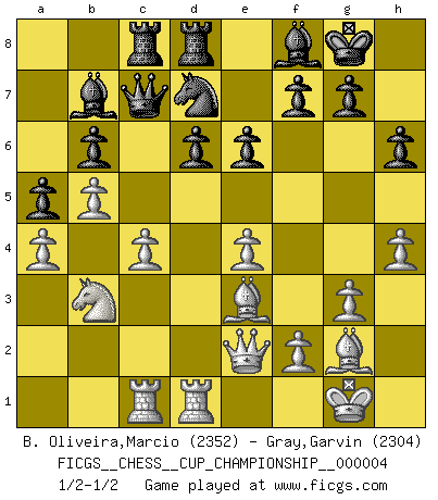Last move : 1/2-1/2 2021 December 4 18:47:39 [Event "FICGS__CHESS__CUP_CHAMPIONSHIP__000004"] [Site "FICGS"] [Date "2021.09.20"] [Round "1"] [White "B. Oliveira,Marcio"] [Black "Gray,Garvin"] [Result "1/2-1/2"] [WhiteElo "2352"] [BlackElo "2304"] 1.Nf3 Nf6 2.c4 c5 3.Nc3 e6 4.g3 Nc6 5.Bg2 Qb6 6.O-O Be7 7.e4 d6 8.Rb1 a6 9.a3 O-O 10.d3 Qc7 11.b4 Nd7 12.Be3 b6 13.h4 Bf6 14.Ne2 Be7 15.d4 cxd4 16.Nexd4 Bb7 17.Qe2 Rfc8 18.Rfc1 Nxd4 19.Nxd4 h6 20.Rb2 Nf6 21.Bd2 Nd7 22.Rbc2 Bf6 23.Be3 Rd8 24.Rd1 Rac8 25.a4 Be7 26.R2c1 Bf8 27.Nb3 a5 28.b5 Ne5 29.Nd2 Nd7 30.Nb3 Be7 31.Bf4 Ne5 32.Be3 Bf6 33.Bf4 Be7 34.Be3 Bf8 35.Nd2 Nd7 36.Nb3 1/2-1/2 Reti Opening Kingside Castling by player White (move 6) Kingside Castling by player Black (move 9) This chess game ended in a draw. Follow this game move after move (download)Chess is a beautiful mistress. (Bent Larsen) Man gibt nur Pakete auf. (Paul Keres) Alekhine es un poeta que crea un trabajo de arte de algo que raramente inspiraría a otra persona a mandar una tarjeta postal. (Max Euwe) Mon pion favori sur ma case favorite ! Bronstein en parlant d'un coup de pion en h5 quand il avait les Noirs. Good luck. You're gonna need it. (Han Solo in Star Wars ep.6)