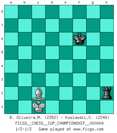 Last move : 1/2-1/2 2022 February 21 11:24:47 [Event "FICGS__CHESS__CUP_CHAMPIONSHIP__000004"] [Site "FICGS"] [Date "2021.09.20"] [Round "1"] [White "B. Oliveira,Marcio"] [Black "Koslowski,Volker"] [Result "1/2-1/2"] [WhiteElo "2352"] [BlackElo "2246"] 1.e4 e5 2.Nf3 Nc6 3.d4 exd4 4.Nxd4 Nf6 5.Nxc6 bxc6 6.e5 Qe7 7.Qe2 Nd5 8.c4 Ba6 9.b3 g6 10.Ba3 Nb4 11.Bb2 Bg7 12.a3 Nd5 13.Nd2 O-O 14.O-O-O Rae8 15.Qf3 Nb6 16.Ne4 Bxe5 17.Bxe5 Qxe5 18.Nf6+ Kh8 19.Nxe8 Qa1+ 20.Kc2 Qa2+ 21.Kc3 Rxe8 22.Bd3 Qxa3 23.Qf6+ Kg8 24.Ra1 Qc5 25.Kd2 Re6 26.Qd8+ Kg7 27.Rxa6 Rf6 28.f3 d5 29.Rxb6 cxb6 30.cxd5 cxd5 31.Rd1 Qf2+ 32.Kc1 Qxg2 33.Qxd5 Qxf3 34.Qd4 Qf4+ 35.Qxf4 Rxf4 36.Bc4 a5 37.Rd7 a4 38.Bd5 axb3 39.Bxb3 Rf2 40.h3 h5 41.Rb7 g5 42.Bd1 g4 43.hxg4 h4 44.Rxb6 h3 45.g5 h2 46.Rh6 f6 47.Rxh2 Rxh2 48.gxf6+ Kxf6 49.Bc2 1/2-1/2 Scotch : Mieses variation Kingside Castling by player Black (move 13) Queenside Castling by player White (move 14) 10 pieces endgame at move 39 : White KRBP , Black KRPPPP WHITE : King + 1 Rook 1 Bishop 1 Pawn BLACK : King + 1 Rook 4 Pawns 9 pieces endgame at move 43 : White KRBP , Black KRPPP WHITE : King + 1 Rook 1 Bishop 1 Pawn BLACK : King + 1 Rook 3 Pawns 8 pieces endgame at move 44 : White KRBP , Black KRPP WHITE : King + 1 Rook 1 Bishop 1 Pawn BLACK : King + 1 Rook 2 Pawns 7 pieces endgame at move 47 : White KRBP , Black KRP WHITE : King + 1 Rook 1 Bishop 1 Pawn BLACK : King + 1 Rook 1 Pawn 6 pieces endgame at move 47 : White KBP , Black KRP WHITE : King + 1 Bishop 1 Pawn BLACK : King + 1 Rook 1 Pawn 5 pieces endgame at move 48 : White KBP , Black KR WHITE : King + 1 Bishop 1 Pawn BLACK : King + 1 Rook 4 pieces endgame at move 48 : White KB , Black KR WHITE : King + 1 Bishop BLACK : King + 1 Rook This chess game ended in a draw. Follow this game move after move (download)A strong memory, concentration, imagination, and a strong will is required to become a great Chess player. (Bobby Fischer) Den Ruhm habe ich schon, jetzt brauche ich noch das Geld. (Wilhelm Steinitz) Hasta este punto, las blancas han seguido un análisis bien conocido. Pero ahora el hace un error fatal: empieza a usar su propia cabeza. (Siegbert Tarrasch) Le thème de l'attaque double intervient d'une manière ou d'une autre dans l'immense majorité des combinaisons. (Youri Averbakh) If I had no sense of humor, I would long ago have committed suicide. (Mahatma Gandhi)