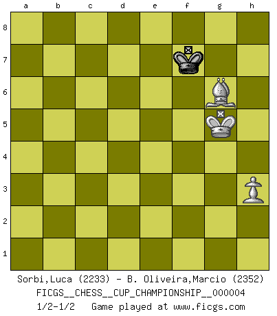 Last move : 1/2-1/2 2021 December 16 22:17:1 [Event "FICGS__CHESS__CUP_CHAMPIONSHIP__000004"] [Site "FICGS"] [Date "2021.09.20"] [Round "1"] [White "Sorbi,Luca"] [Black "B. Oliveira,Marcio"] [Result "1/2-1/2"] [WhiteElo "2233"] [BlackElo "2352"] 1.e4 d6 2.d4 Nf6 3.Nc3 e5 4.Nf3 Nbd7 5.h3 Be7 6.g4 h6 7.Be3 c6 8.a4 a6 9.a5 Qc7 10.Qd2 Rb8 11.Be2 b5 12.axb6 Nxb6 13.dxe5 dxe5 14.Nxe5 Nxe4 15.Nxe4 Qxe5 16.Nc3 Bg5 17.Bxg5 hxg5 18.O-O-O Be6 19.Qd6 Nd7 20.Rhe1 Qxd6 21.Rxd6 Ne5 22.Bxa6 Ke7 23.R6d1 f6 24.Bf1 Rb4 25.b3 Rf4 26.Re2 Ra8 27.Bg2 Ra1+ 28.Nb1 Ra8 29.R1d2 Rb8 30.Nc3 c5 31.Be4 c4 32.b4 Rxb4 33.Re3 Rb6 34.Kd1 Ra6 35.Ke1 Ra1+ 36.Rd1 Rxd1+ 37.Nxd1 c3 38.Nxc3 Nc4 39.Re2 Ne5 40.f3 g6 41.Nd5+ Bxd5 42.Bxd5 Kd7 43.Kf2 Rd4 44.Be4 Kd6 45.Ke3 Rc4 46.Rd2+ Ke7 47.Rd1 f5 48.gxf5 gxf5 49.Bxf5 Nxf3 50.Bd3 Rf4 51.Rf1 Nd4 52.Rxf4 Nxc2+ 53.Bxc2 gxf4+ 54.Kxf4 Ke6 55.Kg5 Kf7 56.Bg6+ 1/2-1/2 Pirc defense Queenside Castling by player White (move 18) 10 pieces endgame at move 49 : White KRBPPP , Black KRNP WHITE : King + 1 Rook 1 Bishop 3 Pawns BLACK : King + 1 Rook 1 Knight 1 Pawn 9 pieces endgame at move 49 : White KRBPP , Black KRNP WHITE : King + 1 Rook 1 Bishop 2 Pawns BLACK : King + 1 Rook 1 Knight 1 Pawn 8 pieces endgame at move 52 : White KRBPP , Black KNP WHITE : King + 1 Rook 1 Bishop 2 Pawns BLACK : King + 1 Knight 1 Pawn 7 pieces endgame at move 52 : White KRBP , Black KNP WHITE : King + 1 Rook 1 Bishop 1 Pawn BLACK : King + 1 Knight 1 Pawn 6 pieces endgame at move 53 : White KRBP , Black KP WHITE : King + 1 Rook 1 Bishop 1 Pawn BLACK : King + 1 Pawn 5 pieces endgame at move 53 : White KBP , Black KP WHITE : King + 1 Bishop 1 Pawn BLACK : King + 1 Pawn 4 pieces endgame at move 54 : White KBP , Black K WHITE : King + 1 Bishop 1 Pawn BLACK : King + This chess game ended in a draw. Follow this game move after move (download)Some sacrifices are sound; the rest are mine. (Mikhail Tal) Was ist der Unterschied zwischen einem Strassenarbeiter und einem Schachspieler? --Der Schachspieler bewegt sich ab und zu. (Anonymous) El Jaque al descubierto es el bombardero del tablero. (Reuben Fine) Les Echecs sont affaire de jugement sensible. Savoir quand frapper et quand esquiver. (Fischer) The modern world has divided itself into Conservatives and Progressives. The business of Progressives is to go on making mistakes. The business of the Conservatives is to prevent the mistakes from being corrected. (G.K. Chesterton)