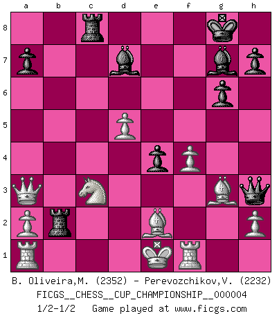 Last move : 1/2-1/2 2021 October 15 0:31:0 [Event "FICGS__CHESS__CUP_CHAMPIONSHIP__000004"] [Site "FICGS"] [Date "2021.09.20"] [Round "1"] [White "B. Oliveira,Marcio"] [Black "Perevozchikov,Vjacheslav"] [Result "1/2-1/2"] [WhiteElo "2352"] [BlackElo "2232"] 1.d4 Nf6 2.c4 g6 3.Nf3 Bg7 4.Nc3 d5 5.Qb3 dxc4 6.Qxc4 O-O 7.e4 Nc6 8.Be2 e5 9.d5 Nd4 10.Nxd4 exd4 11.Qxd4 c6 12.Qc4 b5 13.Qxc6 Bd7 14.Qd6 Re8 15.f3 Nh5 16.Be3 f5 17.Qa3 b4 18.Qxb4 Rb8 19.Qa3 fxe4 20.f4 Qh4+ 21.g3 Nxg3 22.Bf2 Qh3 23.Bxg3 Rec8 24.Rf1 Rxb2 1/2-1/2 King's Indian, 3.Nf3 Kingside Castling by player Black (move 6) This chess game ended in a draw. Follow this game move after move (download)One bad move nullifies forty good ones. (Horowitz) Kein Schachspieler kann gut schlafen. (H. G. Wells) Un Peón pasado aumenta su poder a medida de que el número de piezas en el tablero disminuye. (Capablanca) La tactique, c'est ce que vous faites quand il y a quelque chose à faire; la stratégie, c'est ce que vous faites quand il n'y a rien à faire. (Savielli Tartacower) If you are good, you will be assigned all the work. If you are really good, you will get out of it. (Dan Rotaru)