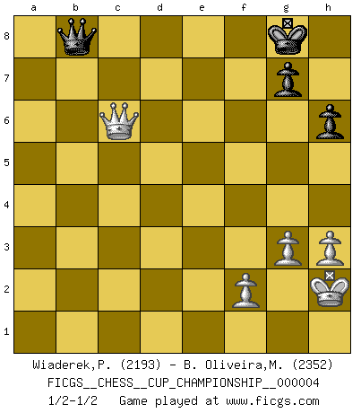 Last move : 1/2-1/2 2021 November 21 15:15:26 [Event "FICGS__CHESS__CUP_CHAMPIONSHIP__000004"] [Site "FICGS"] [Date "2021.09.20"] [Round "1"] [White "Wiaderek,Piotr"] [Black "B. Oliveira,Marcio"] [Result "1/2-1/2"] [WhiteElo "2193"] [BlackElo "2352"] 1.e4 d6 2.d4 Nf6 3.Nc3 e5 4.Nf3 Nbd7 5.Bc4 Be7 6.O-O O-O 7.a4 c6 8.h3 Re8 9.Re1 h6 10.a5 exd4 11.Nxd4 Nc5 12.Bf4 Bf8 13.Qf3 Ncd7 14.Qd1 Nc5 15.e5 dxe5 16.Bxe5 a6 17.Ba2 Ncd7 18.Bg3 Nc5 19.Rxe8 Qxe8 20.Bh4 Qe5 21.Qd2 Be6 22.Bg3 Qh5 23.Nxe6 Nxe6 24.Bxe6 fxe6 25.Ra4 Re8 26.Ne4 Be7 27.Bc7 Qd5 28.Qe1 e5 29.b3 Nd7 30.Nc3 Qe6 31.Re4 Bf8 32.Na4 Qf5 33.Qe2 Qf7 34.Bb6 Qe6 35.Nc3 Nf6 36.Ra4 Nd5 37.Rc4 Bd6 38.Ne4 Nxb6 39.axb6 Be7 40.Nc3 Bd8 41.Qe3 Re7 42.Na4 e4 43.Rd4 Re8 44.Nc5 Qg6 45.Rxe4 Rxe4 46.Nxe4 Bxb6 47.Qxb6 Qxe4 48.Qxb7 Qxc2 49.Qxa6 Qxb3 50.Qxc6 Qb1+ 51.Kh2 Qb8+ 52.g3 1/2-1/2 Pirc defense Kingside Castling by player White (move 6) Kingside Castling by player Black (move 6) 10 pieces endgame at move 49 : White KQPPP , Black KQPPP WHITE : King + 1 Queen 3 Pawns BLACK : King + 1 Queen 3 Pawns 9 pieces endgame at move 50 : White KQPPP , Black KQPP WHITE : King + 1 Queen 3 Pawns BLACK : King + 1 Queen 2 Pawns This chess game ended in a draw. Follow this game move after move (download)The battle for the ultimate truth will never be won. And that's why Chess is so fascinating. (Hans Kmoch) Um dein Spiel zu verbessern musst du zuallererst das Endspiel studieren, denn diese kann unabhängig studiert werden. Die Eröffnung und das Mittelspiel müssen immer in Bezug gesetzt werden zum Endspiel. (José Raúl Capablanca) Fischer no está bajo la obligación de nadie. (Joseph Platz) Botvinnik disait en comparant les échecs à la musique: Il existe une science dont le but est l'étude de l'acoustique et des sons. Mais il y a aussi un art qui se sert de l'océan des sons : c'est la musique. De toute évidence, il en est de même pour la pensée. La logique est l'étude des lois de la réflexion et les échecs reflètent, en tant qu'art, le côté logique de la réflexion, sous la forme d'images artistiques... Extrait de Fischer - Spassky, Reykjavik 1972 par Alexander & F. Wyndham (Ed. Solar), p 37. There are three kinds of lies: lies, damned lies and statistics. (Mark Twain)