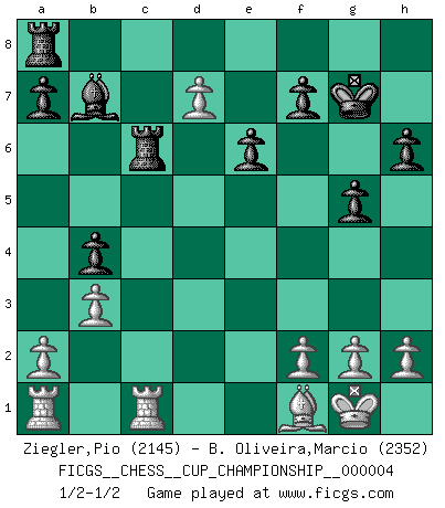 Last move : 1/2-1/2 2021 October 22 23:42:31 [Event "FICGS__CHESS__CUP_CHAMPIONSHIP__000004"] [Site "FICGS"] [Date "2021.09.20"] [Round "1"] [White "Ziegler,Pio"] [Black "B. Oliveira,Marcio"] [Result "1/2-1/2"] [WhiteElo "2145"] [BlackElo "2352"] 1.d4 Nf6 2.c4 e6 3.Nf3 d5 4.Nc3 c6 5.Bg5 h6 6.Bh4 dxc4 7.e4 g5 8.Bg3 b5 9.Ne5 Nbd7 10.Be2 Bg7 11.O-O Nxe5 12.Bxe5 O-O 13.Qc2 Bb7 14.b3 c5 15.dxc5 b4 16.Nb5 Nxe4 17.Bxg7 Kxg7 18.Qxc4 Qd5 19.Rfc1 Nc3 20.Bf1 Qxc4 21.Bxc4 Ne4 22.Bf1 Rfc8 23.Nd6 Nxd6 24.cxd6 Rc6 25.d7 1/2-1/2 Queen's pawn game Kingside Castling by player White (move 11) Kingside Castling by player Black (move 12) This chess game ended in a draw. Follow this game move after move (download)Of all my Russian books, the defense contains and diffuses the greatest 'warmth' which may seem odd seeing how supremely abstract Chess is supposed to be. (Vladimir Nabokov) Schach sollte überall auf der Welt Schulfach werden. Es fördert die geistige Auseinandersetzung. Es lehrt die Demut in der Niederlage. (Garry Kasparov) Hay dos clases de hombres: aquellos que se conforman en dejarse llevar por las circunstancias y que juegan barajas y aquellos decididos a controlar las circunstancias y que juegan al Ajedrez. (Mortimer Collins) Plusieurs personnes se sont demandées comment Tal faisait pour gagner... En fait, c'est très simple ! Il met ses pièces au centre de l'échiquier et les sacrifie quelque part ! (David Bronstein) As the days dwindle down... to a precious few. (Maxwell Anderson)