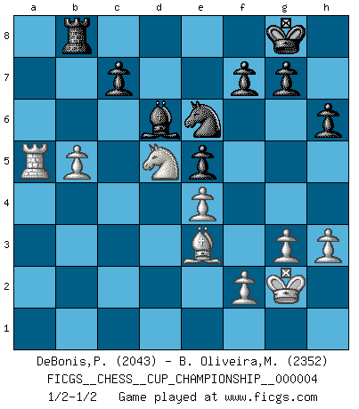 Last move : 1/2-1/2 2021 November 4 3:46:8 [Event "FICGS__CHESS__CUP_CHAMPIONSHIP__000004"] [Site "FICGS"] [Date "2021.09.20"] [Round "1"] [White "DeBonis,Patrick"] [Black "B. Oliveira,Marcio"] [Result "1/2-1/2"] [WhiteElo "2043"] [BlackElo "2352"] 1.e4 d6 2.d4 Nf6 3.Nc3 e5 4.Nf3 Nbd7 5.Bc4 Be7 6.O-O O-O 7.a4 exd4 8.Qxd4 Nc5 9.h3 Be6 10.Re1 Re8 11.b4 Bxc4 12.Qxc4 Ne6 13.Nd5 a5 14.bxa5 Rxa5 15.Bd2 Ra8 16.a5 Nd7 17.Rab1 b6 18.axb6 Nxb6 19.Qc6 Nd7 20.Ra1 Rc8 21.Ra7 Ne5 22.Nxe5 dxe5 23.Be3 Bd6 24.g3 Ra8 25.Rea1 Rxa7 26.Rxa7 Qb8 27.Kg2 Rd8 28.c4 h6 29.Qb5 Qxb5 30.cxb5 Rb8 31.Ra5 1/2-1/2 Pirc defense Kingside Castling by player White (move 6) Kingside Castling by player Black (move 6) This chess game ended in a draw. Follow this game move after move (download)Chess is like war on a board. (Bobby Fischer) Ich hatte Angst gegen einen russischen Großmeister zu verlieren, und er befürchtete gegen einen kleinen Jungen zu verlieren. (über ein Remis gegen Juri Awerbach). (Robert James Fischer) El juego del Ajedrez no es solamente una diversión quieta; algunas cualidades muy valuables de la mente se pueden adquirir y cultivar con el, como convertirlos en habitos disponibles para toda ocasión; ya que la vida es algo así como el Ajedrez. (Benjamin Franklin) Le plus grand jeu de l'esprit jamais inventé, plus vous l'apprenez, plus vous y prenez du plaisir. (Garry Kasparov) Those who make the worst use of their time are the first to complain of its brevity. (Jean de la Bruyere)