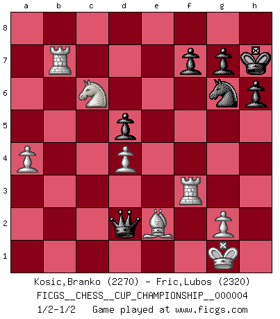 Last move : 1/2-1/2 2022 April 9 22:56:15 [Event "FICGS__CHESS__CUP_CHAMPIONSHIP__000004"] [Site "FICGS"] [Date "2021.09.20"] [Round "1"] [White "Kosic,Branko"] [Black "Fric,Lubos"] [Result "1/2-1/2"] [WhiteElo "2270"] [BlackElo "2320"] 1.c4 e5 2.Nc3 Nf6 3.Nf3 Nc6 4.e4 Bb4 5.d3 d6 6.a3 Bc5 7.b4 Bb6 8.Be3 Bd7 9.Be2 Bxe3 10.fxe3 Ne7 11.O-O O-O 12.h3 c6 13.a4 Ng6 14.Qe1 h6 15.Rb1 Rc8 16.Qg3 Be6 17.Kh2 a5 18.b5 Nh5 19.Qf2 Nf6 20.Rfc1 d5 21.c5 Kh7 22.exd5 cxd5 23.d4 exd4 24.exd4 Ne4 25.Qe1 Re8 26.Nd2 Qc7+ 27.Kg1 Nxc3 28.Rxc3 Bxh3 29.Qf1 Qf4 30.Nb3 Bf5 31.Rb2 Qg5 32.Nxa5 Rc7 33.c6 bxc6 34.b6 Rce7 35.Qf2 Bg4 36.Bf1 Re1 37.Nxc6 Bc8 38.b7 Bxb7 39.Rxb7 R8e2 40.Qxe2 Rxe2 41.Bxe2 Qd2 42.Rf3 1/2-1/2 English Opening Kingside Castling by player White (move 11) Kingside Castling by player Black (move 11) This chess game ended in a draw. Follow this game move after move (download)It began to feel as though you were playing against Chess itself. - On playing against Robert Fischer. (Walter Shipman) Als er Schachweltmeister wurde ließ er praktisch alle stärksten Sovietspieler für sich arbeiten. Wenn ein auch nur mittelmässiger Meister ein Spezialist für eine bestimmte Eröffnung war, wurde er von Karpov gerufen. Das wurde alles geheim gehalten. (Mikhail Moiseyevich Botvinik) El Ajedrez es un cuento de Hadas de las 1001 metidas de pata. (Savielly Tartakower) La solitude du joueur d'Echecs à l'approche du mat est semblable à celle du condamné. (Francis Szpiner) In fact if nothing is done against this teddy bear, hereby I announce that I would quit chess, rapid chess, blitz chess, postal chess, email chess, server chess and correspondence chess I will then switch to a table game where teddy bears aren't going to be seen for a while, like Poker, or Roulette, all 18+ games. (Elmer Valderrama)