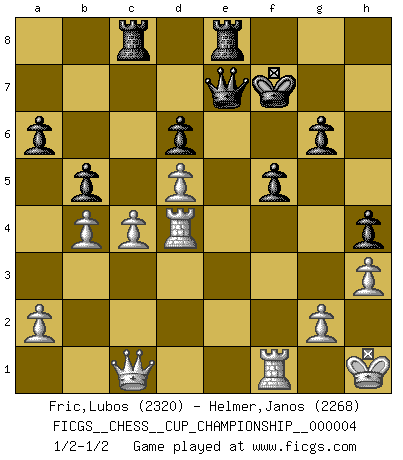 Last move : 1/2-1/2 2021 December 6 7:44:1 [Event "FICGS__CHESS__CUP_CHAMPIONSHIP__000004"] [Site "FICGS"] [Date "2021.09.20"] [Round "1"] [White "Fric,Lubos"] [Black "Helmer,Janos"] [Result "1/2-1/2"] [WhiteElo "2320"] [BlackElo "2268"] 1.e4 c5 2.Nf3 d6 3.d4 cxd4 4.Nxd4 Nf6 5.Nc3 a6 6.Be3 e5 7.Nb3 Be6 8.f3 h5 9.Qd2 Nbd7 10.Nd5 Bxd5 11.exd5 g6 12.Be2 Bg7 13.O-O b6 14.Kh1 Qc7 15.Rad1 h4 16.f4 Ne4 17.Qe1 f5 18.Bd3 Nec5 19.Nxc5 Nxc5 20.fxe5 Bxe5 21.h3 Qe7 22.b4 Nxd3 23.Rxd3 b5 24.Qc1 Kf7 25.Bd4 Rhe8 26.Qh6 Rh8 27.Qc1 Rhe8 28.c4 Bxd4 29.Rxd4 Rac8 1/2-1/2 Sicilian : Najdorf, Byrne (English) attack Kingside Castling by player White (move 13) This chess game ended in a draw. Follow this game move after move (download)Chess is a cold bath for the mind. (Sir John Simon) Wie kann ich Remis annehmen? Ich weiß ja gar nicht, wie ich stehe! (Fritz Sämisch) El estómago es una parte esencial del maestro de Ajedrez. (Bent Larsen) D'abord les bases : Jouez et étudiez, puis étudiez et jouez, ensuite jouez et étudiez, puis étudiez et jouez. Deuxièmement : Donnez toujours le meilleur de vous-même ! (Ken Smith) To err is human, but to really foul things up requires a computer. (Farmer's Almanac, 1978)