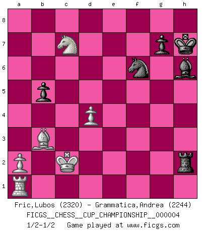 Last move : 1/2-1/2 2021 November 2 12:36:50 [Event "FICGS__CHESS__CUP_CHAMPIONSHIP__000004"] [Site "FICGS"] [Date "2021.09.20"] [Round "1"] [White "Fric,Lubos"] [Black "Grammatica,Andrea"] [Result "1/2-1/2"] [WhiteElo "2320"] [BlackElo "2244"] 1.e4 e5 2.Nf3 Nc6 3.Bb5 a6 4.Ba4 Nf6 5.O-O Be7 6.Re1 b5 7.Bb3 O-O 8.c3 d5 9.exd5 Nxd5 10.Nxe5 Nxe5 11.Rxe5 c6 12.d4 Bd6 13.Re1 Qh4 14.g3 Qh3 15.Qf3 Bg4 16.Qg2 Qh5 17.Be3 Rae8 18.Nd2 Re6 19.f3 Nxe3 20.Qf2 Nd5 21.fxg4 Qxg4 22.Qf3 Qg6 23.Rxe6 fxe6 24.Qe4 Bxg3 25.Qxg6 Bf2+ 26.Kg2 hxg6 27.Nf3 g5 28.Nxg5 Be3 29.Nxe6 Rf2+ 30.Kg3 Rxb2 31.Kf3 Rf2+ 32.Ke4 Bd2 33.c4 Nf6+ 34.Kd3 Bh6 35.cxb5 cxb5 36.Nc7 Kh7 37.Nxa6 Rxh2 38.Nc7 Rh3+ 39.Kc2 Rh2+ 40.Kd3 Rh3+ 41.Kc2 Rh2+ 1/2-1/2 Ruy Lopez : Closed, 7...O-O Kingside Castling by player White (move 5) Kingside Castling by player Black (move 7) This chess game ended in a draw. Follow this game move after move (download)Fischer is completely natural. He plays no roles. He's like a child. Very, very simple. (Zita Rajcsanyi) Schach ist ein Reich, wo sich die menschliche Phantasie frei entfalten kann. (David Bronstein) No todos los artistas son jugadores de Ajedrez, pero todos los jugadores de Ajedrez son artistas. (Marcel Duchamp) Les échecs, c'est la lutte contre l'erreur. (Johannes Zukertort) I couldn't make any sense out of what this particular thread is about. It sounds like R2 D2 computer speaking. A space fight ?!? Some 'command' problems in Moscow ? Some killers & narcotic addicts attacking some game & a god wannabe ?? (Dinesh De Silva, lost in a russian conflict in FICGS forum)