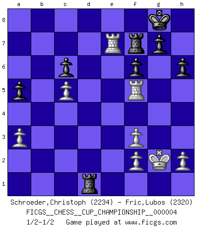 Last move : 1/2-1/2 2021 December 19 13:26:13 [Event "FICGS__CHESS__CUP_CHAMPIONSHIP__000004"] [Site "FICGS"] [Date "2021.09.20"] [Round "1"] [White "Schroeder,Christoph"] [Black "Fric,Lubos"] [Result "1/2-1/2"] [WhiteElo "2234"] [BlackElo "2320"] 1.e4 e5 2.Nf3 Nc6 3.Bb5 Nf6 4.Nc3 Nd4 5.Ba4 c6 6.Nxe5 d6 7.Nf3 Bg4 8.d3 d5 9.exd5 Nxd5 10.O-O Be7 11.Re1 a5 12.Nxd5 Qxd5 13.Re4 Nxf3+ 14.gxf3 Bf5 15.Re1 b5 16.c4 Qd7 17.Bc2 O-O 18.d4 Bd6 19.c5 Bxc2 20.Qxc2 Bc7 21.Kg2 h6 22.Qd3 Rad8 23.Be3 Qc8 24.Bd2 Rd5 25.Re4 Qd7 26.Rae1 Be5 27.Rxe5 Rxd4 28.Qc3 b4 29.Qe3 Rxd2 30.Re2 Rd3 31.Qf4 Rd1 32.a3 Qd3 33.Qf5 bxa3 34.bxa3 Qxf5 35.Rxf5 f6 36.Re7 Rf7 1/2-1/2 Ruy Lopez : Berlin defense Kingside Castling by player White (move 10) Kingside Castling by player Black (move 17) This chess game ended in a draw. Follow this game move after move (download)Half the variations which are calculated in a tournament game turn out to be completely superfluous. Unfortunately, no one knows in advance which half. (Jan Tinman) Drei Punkte vor allen anderen ist wie einer, der im weißen Anzug posiert, während der Rest in Müllsäcke gekleidet dasteht. (Viktor Kortschnoi) ¿Se han dado cuenta de que Fischer casi nunca ha tenido piezas malas? El las intercambia y las piezas malas se quedan con sus oponenets. (Yuri Balashov) Pour moi, les échecs ne sont pas un jeu mais un art. (Alexandre Alekhine) You know what they say : You lie down with the Devil, you wake up in Hell. (Horatio Caine, C.S.I. Miami)