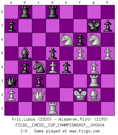 Last move : 1-0 2021 November 20 5:5:23 [Event "FICGS__CHESS__CUP_CHAMPIONSHIP__000004"] [Site "FICGS"] [Date "2021.09.20"] [Round "1"] [White "Fric,Lubos"] [Black "Wiaderek,Piotr"] [Result "1-0"] [WhiteElo "2320"] [BlackElo "2193"] 1.e4 e6 2.d4 d5 3.Nc3 Nf6 4.e5 Nfd7 5.f4 c5 6.Nf3 Nc6 7.Be3 Qb6 8.Na4 Qa5+ 9.c3 b6 10.Bd2 c4 11.b4 Nxb4 12.cxb4 Bxb4 13.Qc2 Bxd2+ 14.Nxd2 b5 15.Nc3 O-O 16.g3 b4 17.Ne2 Nb6 18.Kf2 Qa3 19.g4 Rb8 20.h4 f6 21.exf6 gxf6 22.Rh3 c3 23.Rg3 Kh8 24.Nb3 e5 25.h5 Nc4 26.Bg2 e4 27.f5 Bd7 28.Nc5 Bb5 29.Nf4 Rfd8 30.Re1 Nd2 31.Rd1 Nc4 32.Ng6+ Kg7 33.Ne6+ 1-0 French : Steinitz, Boleslavsky variation Kingside Castling by player Black (move 15) Player White won this chess game. Follow this game move after move (download)Good positions don't win games, good moves do. (Gerald Abrahams) Wenn ich einen Club besuche, sind die Spieler stumm vor Staunen. (José Raúl Capablanca) Nos gusta pensar. (Gary Kasparov) On a dit que l'homme se distingue de l'animal par le fait qu'il achète plus de livres qu'il ne peut en lire. Je voudrais suggérer qu'inclure à la liste des livres quelques livres d'échecs rendrait la distinction manifeste. (Edward Lasker) Empty your mind, be formless, shapeless — like water. (Bruce Lee)