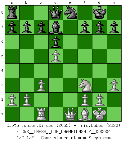 Last move : 1/2-1/2 2021 November 25 10:10:27 [Event "FICGS__CHESS__CUP_CHAMPIONSHIP__000004"] [Site "FICGS"] [Date "2021.09.20"] [Round "1"] [White "Cleto Junior,Dirceu"] [Black "Fric,Lubos"] [Result "1/2-1/2"] [WhiteElo "2063"] [BlackElo "2320"] 1.e4 e5 2.Nf3 Nc6 3.Bb5 Nf6 4.O-O Nxe4 5.Re1 Nd6 6.Nxe5 Be7 7.Bf1 Nxe5 8.Rxe5 O-O 9.d4 Bf6 10.Re1 Re8 11.c3 Rxe1 12.Qxe1 Ne8 13.d5 d6 14.Nd2 Bg5 15.h3 Bd7 16.Nf3 Bxc1 17.Rxc1 1/2-1/2 Ruy Lopez : Berlin defense, Open variation Kingside Castling by player White (move 4) Kingside Castling by player Black (move 8) This chess game ended in a draw. Follow this game move after move (download)War is the child of passion, passion is the child of narcissism and narcissism is the child. (...) Another game ? (Thibault de Vassal) Ich habe die besten Aussichten, den ersten Preis zu gewinnen - denn jeder muss gegen Steinitz spielen, nur ich nicht! (Wilhelm Steinitz) Debemos de asegurarnos de que el Ajedrez no se convierta en un lenguaje muerto, muy interesante, pero solo para un grupo muy pequeño. (Sytze Faber) L'attaque fait le spectacle, la défense gagne les matchs. (Dicton footballistique) It is not true that people stop pursuing dreams because they grow old, they grow old because they stop pursuing dreams. (Gabriel Garcia Marquez)