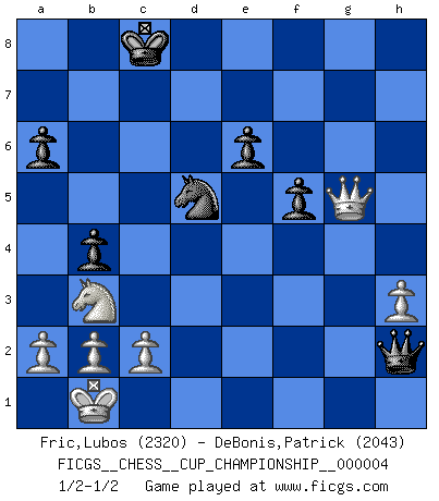 Last move : 1/2-1/2 2021 December 28 12:7:12 [Event "FICGS__CHESS__CUP_CHAMPIONSHIP__000004"] [Site "FICGS"] [Date "2021.09.20"] [Round "1"] [White "Fric,Lubos"] [Black "DeBonis,Patrick"] [Result "1/2-1/2"] [WhiteElo "2320"] [BlackElo "2043"] 1.e4 c5 2.Nf3 Nc6 3.d4 cxd4 4.Nxd4 e6 5.Nc3 Qc7 6.Be3 a6 7.Qf3 Ne5 8.Qg3 b5 9.O-O-O Nf6 10.f4 Neg4 11.Bg1 h5 12.e5 b4 13.Na4 Nd5 14.h3 Nh6 15.f5 Bb7 16.Bd3 Be7 17.Kb1 h4 18.Qe1 Nf4 19.Be4 Nxg2 20.Qe2 Nf4 21.Qf3 Bxe4 22.Qxe4 Nd5 23.Qg2 Bf8 24.Be3 Rc8 25.Bg5 g6 26.fxg6 Rg8 27.Bxh6 Rxg6 28.Bg5 Be7 29.Nf3 Qc6 30.Rdg1 Qxa4 31.Qf2 Qb5 32.Nd4 Qc5 33.Bxh4 Bxh4 34.Qxh4 Rxg1+ 35.Rxg1 d6 36.exd6 Qxd6 37.Nb3 Qh2 38.Rg8+ Kd7 39.Rxc8 Kxc8 40.Qg5 f5 1/2-1/2 Sicilian defense Queenside Castling by player White (move 9) This chess game ended in a draw. Follow this game move after move (download)I'm not afraid of Spassky. The world knows I'm the best. You don't need a match to prove it. (Bobby Fischer) Am wohlsten fühle ich mich, wenn ich sehe, wie sich mein Gegner im Todeskampf windet. (Robert James Fischer) Bobby Fischer es el mas grande genio de Ajedrez de todos los tiempos. (Alexander Kotov) Avant la finale, les dieux ont créé le milieu de partie. (Tarrasch) Luck is what you have left over after you give 100 percent. (Langston Coleman)