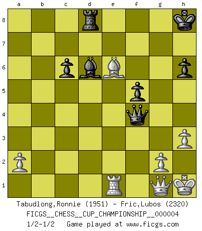 Last move : 1/2-1/2 2021 November 25 2:47:56 [Event "FICGS__CHESS__CUP_CHAMPIONSHIP__000004"] [Site "FICGS"] [Date "2021.09.20"] [Round "1"] [White "Tabudlong,Ronnie"] [Black "Fric,Lubos"] [Result "1/2-1/2"] [WhiteElo "1951"] [BlackElo "2320"] 1.d4 Nf6 2.c4 e6 3.Nf3 d5 4.Nc3 c6 5.Bg5 h6 6.Bxf6 Qxf6 7.e3 Nd7 8.Bd3 dxc4 9.Bxc4 g6 10.O-O Bg7 11.Ne4 Qe7 12.Qc2 O-O 13.Bb3 e5 14.Ng3 Kh8 15.Rad1 Re8 16.dxe5 Nxe5 17.Nxe5 Bxe5 18.f4 Bg7 19.e4 Bg4 20.Rde1 Bd4+ 21.Kh1 Rad8 22.Qc1 Kg7 23.e5 f5 24.exf6+ Qxf6 25.f5 Bxb2 26.Qf4 Bxf5 27.Qc7+ Kh8 28.Nxf5 Be5 29.Qxb7 gxf5 30.Qxa7 Qh4 31.h3 Qg3 32.Qg1 Bd6 33.Re6 Rxe6 34.Bxe6 Qe5 35.Re1 Qf4 36.Rf1 Qe5 37.Re1 Qf4 1/2-1/2 Queen's pawn game Kingside Castling by player White (move 10) Kingside Castling by player Black (move 12) This chess game ended in a draw. Follow this game move after move (download)Before the endgame, the Gods have placed the middle game. (Siegbert Tarrasch) Um dein Spiel zu verbessern musst du zuallererst das Endspiel studieren, denn diese kann unabhängig studiert werden. Die Eröffnung und das Mittelspiel müssen immer in Bezug gesetzt werden zum Endspiel. (José Raúl Capablanca) Fischer es una tragedia del Ajedrez Americano a la par con Morphy y Pillsbury. (Mig Greengard) Dieu déplace le joueur, et celui-ci la pièce. Quel Dieu derrière Dieu commence donc la trame ? Arturo Perez-Reverte (prix de littérature policière 1993). The best weapon against an enemy is another enemy. (Friedrich Nietzsche)