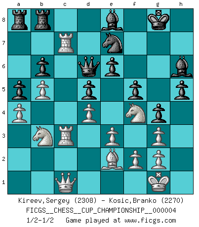 Last move : 1/2-1/2 2022 January 28 6:11:4 [Event "FICGS__CHESS__CUP_CHAMPIONSHIP__000004"] [Site "FICGS"] [Date "2021.09.20"] [Round "1"] [White "Kireev,Sergey"] [Black "Kosic,Branko"] [Result "1/2-1/2"] [WhiteElo "2308"] [BlackElo "2270"] 1.d4 f5 2.Bg5 g6 3.Nc3 Bg7 4.Nf3 Nf6 5.e3 c6 6.Bd3 d6 7.O-O O-O 8.Re1 d5 9.Ne2 Ne4 10.Bh4 Be6 11.Rc1 h6 12.Bg3 Nxg3 13.hxg3 Bf7 14.c4 Qb6 15.Rc3 Nd7 16.Rb3 Qc7 17.cxd5 cxd5 18.Qd2 Rfb8 19.Rc1 Qd8 20.Rc2 a6 21.Qc1 Be8 22.Nf4 Nf8 23.Rbc3 e6 24.Bf1 g5 25.Nd3 Ng6 26.Nc5 Kf7 27.b4 g4 28.Nd2 h5 29.Ndb3 Ne7 30.a4 Qd6 31.b5 a5 32.Nd3 b6 33.Rc7 Kg8 34.Nf4 Bf6 35.Be2 Bg5 36.R2c3 Bh6 1/2-1/2 Dutch, 2.Bg5 variation Kingside Castling by player White (move 7) Kingside Castling by player Black (move 7) This chess game ended in a draw. Follow this game move after move (download)When I have White, I win because I am white; When I have Black, I win because I am Bogolyubov. (Bogolyubov) Schach sollte überall auf der Welt Schulfach werden. Es fördert die geistige Auseinandersetzung. Es lehrt die Demut in der Niederlage. (Garry Kasparov) El jugador táctico debe saber que hacer cuando algo se debe de hacer. El estratégico debe saber que hacer cuando nada se debe de hacer. (Savielly Tartakover) C'est la seule position que je connaisse où les deux camps sont mals. Propos prêtés à V. Anand. CHESS, n. f. [echecs, Fr.] A nice and abstruse game, in which two sets of puppets are moved in opposition to each other. (Dr Samuel Johnson, A Dictionary Of The English Language, 1755)