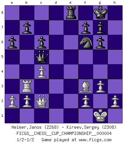 Last move : 1/2-1/2 2021 October 14 6:34:52 [Event "FICGS__CHESS__CUP_CHAMPIONSHIP__000004"] [Site "FICGS"] [Date "2021.09.20"] [Round "1"] [White "Helmer,Janos"] [Black "Kireev,Sergey"] [Result "1/2-1/2"] [WhiteElo "2268"] [BlackElo "2308"] 1.Nf3 d5 2.d4 Nf6 3.c4 c6 4.e3 Bf5 5.Nc3 e6 6.Nh4 Bg6 7.Be2 Nbd7 8.O-O Bd6 9.g3 O-O 10.Nxg6 hxg6 11.Qc2 a6 12.e4 Nxe4 13.Nxe4 dxe4 14.Qxe4 e5 15.Rd1 Nf6 16.Qc2 exd4 17.Rxd4 Qe7 18.Be3 Bc5 19.Rd3 Rfe8 20.Bf3 Bxe3 21.Rxe3 Qc5 22.Rae1 Rxe3 23.Rxe3 Re8 24.Rb3 1/2-1/2 Reti Opening Kingside Castling by player White (move 8) Kingside Castling by player Black (move 9) This chess game ended in a draw. Follow this game move after move (download)The Chess pieces are the block alphabet which shapes thoughts; and these thoughts, although making a visual design on the chessboard, express their beauty abstractly, like a poem. (Marcel Duchamp) Privat ist Kortschnoi kein schlechter Mensch, sehr sympathisch. Aber während des Spiels ist er grausam. Er will dich töten. (Miguel Najdorf) Las piezas de Ajedrez son los bloques del alfabeto que moldean los pensamientos; y esos pensamientos, aunque hagan un diseño visual en el tablero, expresan abstractamente su belleza como un poema. (Marcel Duchamp) Les échecs, c'est la lutte contre l'erreur. (Johannes Zukertort) Chess is as much a mystery as women. (Purdy)
