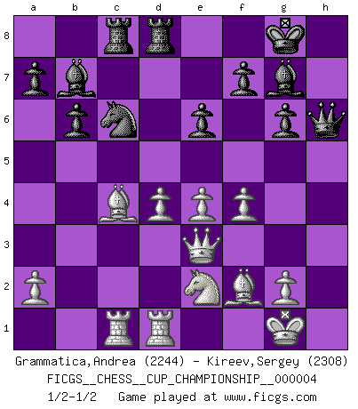 Last move : 1/2-1/2 2021 October 4 19:59:42 [Event "FICGS__CHESS__CUP_CHAMPIONSHIP__000004"] [Site "FICGS"] [Date "2021.09.20"] [Round "1"] [White "Grammatica,Andrea"] [Black "Kireev,Sergey"] [Result "1/2-1/2"] [WhiteElo "2244"] [BlackElo "2308"] 1.d4 Nf6 2.c4 g6 3.Nc3 d5 4.cxd5 Nxd5 5.e4 Nxc3 6.bxc3 Bg7 7.Bc4 c5 8.Ne2 Nc6 9.Be3 O-O 10.O-O b6 11.h4 e6 12.h5 Qh4 13.hxg6 hxg6 14.f3 cxd4 15.cxd4 Rd8 16.Qd2 Bb7 17.Rac1 Bf6 18.Bf2 Qh5 19.Rfd1 Be5 20.f4 Bg7 21.Qe3 Rac8 22.Ng3 Qh6 23.Ne2 Qh5 24.Ng3 Qh6 25.Ne2 1/2-1/2 King's Indian defense, 3.Nc3 Kingside Castling by player Black (move 9) Kingside Castling by player White (move 10) This chess game ended in a draw. Follow this game move after move (download)My God, Bobby Fischer plays so simply. (Alexei Suetin) Offensichtlich kennt Kasparow nichts anderes als Schach, und ich könnte 500 weitere Spieler dieser Sorte benennen. (Judith Polgar) El Ajedrez detiene a su maestro dentro de sus propios vínculos, encadenando la mente y el cerebro, por lo que la libertad interior del mas fuerte debe sufrir. (Albert Einstein) Ce qui caractérise les parties de combat, c'est que si le défenseur a constamment de difficiles problèmes à résoudre, l'attaquant doit chercher sans relâche de nouvelles possibilités d'attaque. (Koblentz) Man with more than one clock never knows what time it is. (Chinese thought)