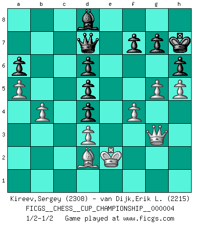 Last move : 1/2-1/2 2021 December 10 23:5:11 [Event "FICGS__CHESS__CUP_CHAMPIONSHIP__000004"] [Site "FICGS"] [Date "2021.09.20"] [Round "1"] [White "Kireev,Sergey"] [Black "van Dijk,Erik L."] [Result "1/2-1/2"] [WhiteElo "2308"] [BlackElo "2215"] 1.e4 e5 2.Nf3 Nc6 3.Bb5 a6 4.Ba4 Nf6 5.O-O b5 6.Bb3 Bb7 7.d3 Be7 8.c4 O-O 9.Nc3 bxc4 10.Bxc4 d6 11.a3 Nd4 12.Nxd4 exd4 13.Nd5 Nxd5 14.exd5 Qd7 15.Re1 Bf6 16.Qf3 Rae8 17.Bd2 c6 18.Rxe8 Rxe8 19.b4 cxd5 20.Bb3 Be5 21.h4 h6 22.a4 Bc6 23.a5 Qb7 24.Rc1 Rc8 25.g4 Qd7 26.h5 Bf6 27.Kh2 Bb7 28.Rxc8+ Qxc8 29.Ba4 Be5+ 30.Kg2 Bf6 31.Kf1 Bd8 32.Qg3 Bc6 33.Bxc6 Qxc6 34.f4 Qd7 35.g5 Kh7 36.Ke2 Qe8+ 37.Kf1 Qd7 38.Ke2 1/2-1/2 Ruy Lopez : Archangelsk (counterthrust) variation Kingside Castling by player White (move 5) Kingside Castling by player Black (move 8) This chess game ended in a draw. Follow this game move after move (download)I thought the most common mistake [in chess] was the first one: Learning the game :P (Garvin Gray, FICGS forum) Wie, soll nun auch die Opposition abgeschafft werden? Ja, es tut mir leid, Ihnen diesen Schmerz nicht ersparen zu können. (Aaron Nimzowitsch) Cuando tu casa esta en llamas, no puedes ser molestado por tus vecinos. O, como decinos en Ajedrez, si tu Rey esta bajo ataque, no te preocupa perder un Peón del lado de la Reina. (Gary Kasparov) La menace est plus forte que l'exécution. (Aaron Nimzovitch) The question of whether computers can think is just like question of whether submarines can swim. (Edsger W. Dijkstra)