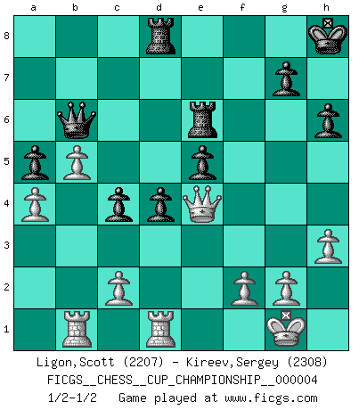 Last move : 1/2-1/2 2021 October 26 12:28:59 [Event "FICGS__CHESS__CUP_CHAMPIONSHIP__000004"] [Site "FICGS"] [Date "2021.09.20"] [Round "1"] [White "Ligon,Scott"] [Black "Kireev,Sergey"] [Result "1/2-1/2"] [WhiteElo "2207"] [BlackElo "2308"] 1.e4 e5 2.Nf3 Nc6 3.d4 exd4 4.Nxd4 Nf6 5.Nc3 Bb4 6.Nxc6 bxc6 7.Bd3 O-O 8.O-O d5 9.exd5 cxd5 10.h3 c6 11.Bf4 Re8 12.Qf3 Be6 13.a3 Bd6 14.b4 a5 15.b5 c5 16.Bxd6 Qxd6 17.Rad1 Rac8 18.Rfe1 c4 19.Bf5 Rcd8 20.Bxe6 fxe6 21.a4 Kh8 22.Ne2 e5 23.Ng3 d4 24.Ne4 Nxe4 25.Qxe4 h6 26.Rb1 Qb6 27.Red1 Re6 1/2-1/2 Scotch : Schmidt variation Kingside Castling by player Black (move 7) Kingside Castling by player White (move 8) This chess game ended in a draw. Follow this game move after move (download)Many Chess players were surprised when after the game, Fischer quietly explained: 'I had already analyzed this possibility' in a position which I thought was not possible to foresee from the opening. (Mikhail Tal) Wie kann ich Remis annehmen? Ich weiß ja gar nicht, wie ich stehe! (Fritz Sämisch) El estómago es una parte esencial del maestro de Ajedrez. (Bent Larsen) On a dit que l'homme se distingue de l'animal par le fait qu'il achète plus de livres qu'il ne peut en lire. Je voudrais suggérer qu'inclure à la liste des livres quelques livres d'échecs rendrait la distinction manifeste. (Edward Lasker) I fear not the man who has practiced 10,000 kicks once, but I fear the man who has practiced one kick 10,000 times. (Bruce Lee)