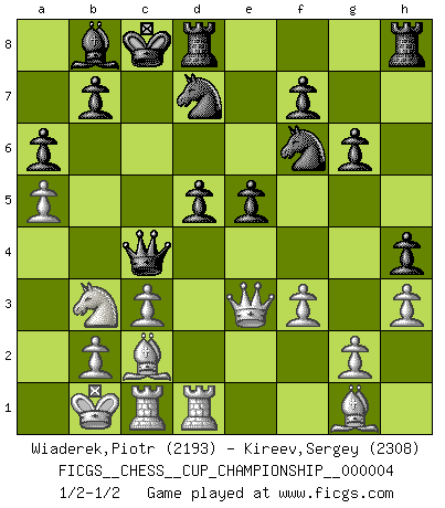 Last move : 1/2-1/2 2021 October 6 20:38:36 [Event "FICGS__CHESS__CUP_CHAMPIONSHIP__000004"] [Site "FICGS"] [Date "2021.09.20"] [Round "1"] [White "Wiaderek,Piotr"] [Black "Kireev,Sergey"] [Result "1/2-1/2"] [WhiteElo "2193"] [BlackElo "2308"] 1.e4 c5 2.Nf3 d6 3.d4 cxd4 4.Nxd4 Nf6 5.Nc3 a6 6.Be3 e5 7.Nb3 Be6 8.f3 h5 9.Nd5 Bxd5 10.exd5 Nbd7 11.Qd2 g6 12.O-O-O Nb6 13.Kb1 Nbxd5 14.Bg5 Be7 15.Bd3 Qc7 16.Rhe1 Nb6 17.a4 O-O-O 18.a5 Nbd7 19.Be3 Kb8 20.Bg1 d5 21.c3 Qc6 22.Qf2 Bd6 23.Rc1 Kc8 24.Red1 Qa4 25.Bc2 Qc4 26.h3 h4 27.Qa7 Bb8 28.Qe3 1/2-1/2 Sicilian : Najdorf, Byrne (English) attack Queenside Castling by player White (move 12) Queenside Castling by player Black (move 17) This chess game ended in a draw. Follow this game move after move (download)Life is like a game of Chess, changing with each move. (Chinese proverb) Schach ist ein Reich, wo sich die menschliche Phantasie frei entfalten kann. (David Bronstein) Ciertamente el estado mental actual de Bobby Fischer es una tragedia. Uno de los mas grandes jugadores de Ajedrez del mundo -el orgullo y pena del Ajedrez Americano. (Frank Brady) Les échecs sont un jeu terrible. Si vous n'avez pas le centre, votre adversaire a une position plus libre. Par contre, si vous avez le centre, alors vous avez vraiment quelque chose pour laquelle vous inquiéter ! (Siegbert Tarrasch) Drag your thoughts away from your troubles... by the ears, by the heels, or any other way you can manage it. (Mark Twain)