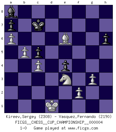 Last move : 1-0 2021 December 8 23:54:44 [Event "FICGS__CHESS__CUP_CHAMPIONSHIP__000004"] [Site "FICGS"] [Date "2021.09.20"] [Round "1"] [White "Kireev,Sergey"] [Black "Vasquez,Fernando"] [Result "1-0"] [WhiteElo "2308"] [BlackElo "2190"] 1.e4 e5 2.Nf3 Nf6 3.Nxe5 d6 4.Nf3 Nxe4 5.d4 d5 6.Bd3 Nc6 7.O-O Be7 8.c4 Nb4 9.Be2 O-O 10.Nc3 Be6 11.Ne5 c5 12.Nxe4 dxe4 13.d5 Bc8 14.a3 Nc6 15.dxc6 Qc7 16.cxb7 Bxb7 17.Qd7 Qxd7 18.Nxd7 Rfd8 19.Rd1 Bc6 20.Ne5 Be8 21.Ng4 Rxd1+ 22.Bxd1 Bd6 23.Bd2 f5 24.Ne3 g6 25.Bc3 Kf7 26.g3 Bc6 27.b4 Be7 28.b5 Bb7 29.Be2 Rd8 30.a4 Bf6 31.Bxf6 Kxf6 32.Rd1 Rd4 33.a5 Ke7 34.a6 Ba8 35.h4 Ke6 36.Nd5 Kd6 37.Kf1 h6 38.h5 gxh5 39.Bxh5 Rd3 40.Ne3 Ke6 41.Ke2 Rd4 42.Bg6 Rxd1 43.Bxf5+ Ke5 44.Kxd1 Kd6 45.Bc8 Kc7 46.Be6 1-0 Petrov : Classical attack Kingside Castling by player White (move 7) Kingside Castling by player Black (move 9) Player White won this chess game. Follow this game move after move (download)There just isn't enough televised Chess. (David Letterman) Eine Person mit durchschnittlichem IQ kann etwa eine ELO von 2000 erreichen. (Jonathan Levitt) Ayuda a tus piezas para que ellas te puedan ayudar. (Paul Morphy) Il n'y a pas eu de défaite parce que je ne crois pas que cet ordinateur ait jamais existé. IBM a triché en refusant d'imprimer les modes de recherche de la machine. C'est évident, pendant le match, des coups décisifs ont été joués par des êtres humains. Aujourd'hui, les meilleurs spécialistes en informatique ne peuvent toujours pas expliquer comment Deep-Blue a pu jouer contre la logique des ordinateurs. IBM a gagné une guerre de communication, mais ils sont incapables de prouver que l'ordinateur a gagné tout seul. (Garry Kasparov) Games, world of games... There's always an opponent, and there's always a victim. (Revolver, movie)