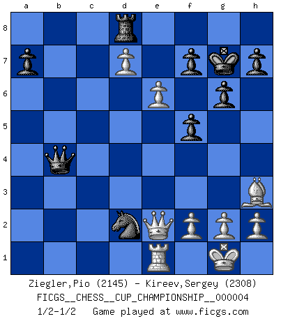 Last move : 1/2-1/2 2021 October 13 15:12:1 [Event "FICGS__CHESS__CUP_CHAMPIONSHIP__000004"] [Site "FICGS"] [Date "2021.09.20"] [Round "1"] [White "Ziegler,Pio"] [Black "Kireev,Sergey"] [Result "1/2-1/2"] [WhiteElo "2145"] [BlackElo "2308"] 1.d4 Nf6 2.c4 g6 3.Nc3 d5 4.cxd5 Nxd5 5.e4 Nxc3 6.bxc3 Bg7 7.Nf3 c5 8.Rb1 O-O 9.Be2 cxd4 10.cxd4 Qa5+ 11.Bd2 Qxa2 12.O-O Bg4 13.Be3 Nc6 14.d5 Bxf3 15.Bxf3 Ne5 16.Be2 Nc4 17.Bg5 Rfc8 18.Rxb7 Bf6 19.Bxf6 exf6 20.Bg4 Rcb8 21.Rxb8+ Rxb8 22.d6 Rd8 23.d7 Qa5 24.Bh3 Nd2 25.Re1 Qb4 26.Qe2 Kg7 27.e5 f5 28.e6 1/2-1/2 Comment by player 1 : Pio Ziegler : Thanks for the game. Best wishes King's Indian defense, 3.Nc3 Kingside Castling by player Black (move 8) Kingside Castling by player White (move 12) This chess game ended in a draw. Follow this game move after move (download)Chess is a foolish expedient for making idle people believe they are doing something very clever when they are only wasting their time. (George Bernard Shaw) Später, ... hatte ich zunehmend Erfolg in entscheidenden Partien. Vielleicht weil ich eine einfache Wahrheit erkannte: nicht nur ich hatte Angst, auch mein Gegner. (Mikhail Nekhemyevich Tal) Yo jugué Ajedrez con el y a veces le pude haber ganado solo que siempre devuelve su última jugada y juega la partida de manera diferente. (Mark Twain) Les réformistes prétendent que les progrès de la théorie conduiront à la disparition des échecs, et qu'il faut, pour leur rendre vie, en remanier les règles. En réalité, qu'exprime cette affirmation? Le mépris de l'intuition, de l'imagination et de tous les autres éléments qui font des échecs un art. (Alexander Alekhine) Crush them ! Make them suffer ! (General Grievous in Star Wars ep.3)