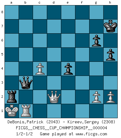 Last move : 1/2-1/2 2021 October 15 17:49:10 [Event "FICGS__CHESS__CUP_CHAMPIONSHIP__000004"] [Site "FICGS"] [Date "2021.09.20"] [Round "1"] [White "DeBonis,Patrick"] [Black "Kireev,Sergey"] [Result "1/2-1/2"] [WhiteElo "2043"] [BlackElo "2308"] 1.e4 c5 2.Nf3 d6 3.d4 cxd4 4.Nxd4 Nf6 5.Nc3 a6 6.Be3 e5 7.Nb3 Be6 8.f3 h5 9.Qd2 Nbd7 10.Nd5 Bxd5 11.exd5 g6 12.O-O-O Nb6 13.Kb1 Nfxd5 14.Bg5 Be7 15.Bxe7 Qxe7 16.Qa5 Ne3 17.Qxb6 Nxd1 18.Bd3 Nxb2 19.Kxb2 Rd8 20.Rd1 d5 21.Qc5 f5 22.Qa5 Rd6 23.Be2 b5 24.Nc5 O-O 25.Nxa6 Qa7 26.Bxb5 Rb8 27.Ka1 R8b6 28.Qa4 Rxa6 29.Bxa6 Rxa6 30.Qb3 Kg7 31.Qxd5 Qc7 32.Kb2 Kh6 33.c4 Qb8+ 34.Ka1 Qb3 35.Qd2+ Kh7 36.Rc1 e4 37.fxe4 fxe4 38.Rb1 Rxa2+ 1/2-1/2 Sicilian : Najdorf, Byrne (English) attack Queenside Castling by player White (move 12) Kingside Castling by player Black (move 24) This chess game ended in a draw. Follow this game move after move (download)Every Chess master was once a beginner. (Chernev) Ein Gewinn durch eine ungenaue Kombination, sei sie auch noch so vorzeigbar, erfüllt mich mit Schaudern. (Wilhelm Steinitz) Solo los afeminados hacen el Enroque. (Rob Sillars) Votre seul travail dans les ouvertures est d'obtenir un milieu de partie jouable. (Lajos Portish) A good aphorism is too hard for the tooth of time, and is not worn away with the centuries, although it serves as food for every speech. (Friedrich Nietzsche)