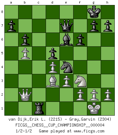 Last move : 1/2-1/2 2021 December 16 0:50:52 [Event "FICGS__CHESS__CUP_CHAMPIONSHIP__000004"] [Site "FICGS"] [Date "2021.09.20"] [Round "1"] [White "van Dijk,Erik L."] [Black "Gray,Garvin"] [Result "1/2-1/2"] [WhiteElo "2215"] [BlackElo "2304"] 1.d4 d5 2.c4 c6 3.Nf3 Nf6 4.Nc3 e6 5.Bg5 Nbd7 6.e3 Be7 7.cxd5 exd5 8.Bd3 Ne4 9.Bf4 Ndf6 10.Qc2 O-O 11.O-O Bd6 12.Bxd6 Nxd6 13.b4 Qe7 14.a4 Be6 15.b5 Rfc8 16.bxc6 Rxc6 17.Ne5 Rc7 18.Qb2 Nfe4 19.Nb5 Nxb5 20.axb5 f6 21.Nf3 b6 22.Rfc1 Rac8 23.Rxc7 Rxc7 24.Rc1 Rxc1+ 1/2-1/2 QGD Slav : 4.Nc3 Kingside Castling by player Black (move 10) Kingside Castling by player White (move 11) This chess game ended in a draw. Follow this game move after move (download)Man is a frivolous, a specious creature, and like a Chess player, cares more for the process of attaining his goal than for the goal itself. (Dostoyevsky) Der Umstand, daß uns eine 7 Stunden Zeitkontrolle ermöglicht eine großartige, tiefe Partie zu spielen, ist für die Massenmedien nicht weiter von Bedeutung. (Alexej Shirov) El Ajedrez es el arte del análisis. (Mikhail Botvinnik) A ce moment-là, je menaçais de comprendre la position ! (Clément L'Heureux) Watch your thoughts; they become words. Watch your words; they become actions. Watch your actions; they become habits. Watch your habits; they become character. Watch your character; it becomes your destiny. (Frank Outlaw)