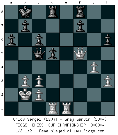 Last move : 1/2-1/2 2021 November 1 12:42:50 [Event "FICGS__CHESS__CUP_CHAMPIONSHIP__000004"] [Site "FICGS"] [Date "2021.09.20"] [Round "1"] [White "Orlov,Vladimir"] [Black "Gray,Garvin"] [Result "1/2-1/2"] [WhiteElo "2207"] [BlackElo "2304"] 1.e4 d6 2.d4 Nf6 3.Nc3 g6 4.Be3 Bg7 5.Qd2 c6 6.Bh6 Bxh6 7.Qxh6 e5 8.Nf3 Qe7 9.Bc4 Nbd7 10.Bb3 exd4 11.Nxd4 Nxe4 12.O-O-O Nxc3 13.bxc3 Nc5 14.Qg7 Rf8 15.Rhe1 Be6 16.f4 d5 17.f5 gxf5 18.Nxf5 Nxb3+ 19.Kb2 Qc5 20.axb3 O-O-O 21.Qf6 Kb8 22.g4 Bxf5 23.Qxf5 h6 24.h3 a6 1/2-1/2 Pirc defense Queenside Castling by player White (move 12) Queenside Castling by player Black (move 20) This chess game ended in a draw. Follow this game move after move (download)He who fears an isolated Queen's Pawn should give up Chess. (Siegbert Tarrasch) Ja, ich habe einmal eine Blitzpartie gespielt, es war in einem Zug, 1929. --im Interview 1989 (Mikhail Moiseyevich Botvinik) El Ajedrez te enseña a controlarl la excitación inicial que sientes cuando vez algo que parece bueno y te enseña a pensar objetivamente cuando te encuentras en problemas. (Stanley Kubrick) Echiquier : carré parfait, comme la Jérusalem nouvelle décrite par l'auteur de l'Apocalypse, huit cases sur huit, exaltation du chiffre 4, symbole du cosmos aux quatre horizons... où le noir et le blanc, l'ombre et la lumière, le mal et le bien s'entremêlent et se conjuguent. (Robert Couffignal, Le Gambit du poète) Inventor: A person who makes an ingenious arrangement of wheels, levers and springs, and believes it civilization. (Ambrose Bierce, The Devil's Dictionary)