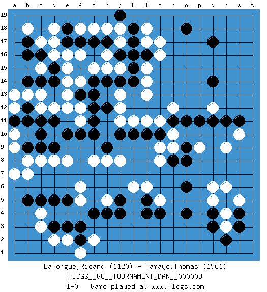 Last move : 1-0 2007 December 20 21:28:46 [Event "FICGS__GO__TOURNAMENT_DAN__000008"] [Site "FICGS"] [Date "2007.07.20"] [Round "1"] [Black "Laforgue,Ricard"] [White "Tamayo,Thomas"] [Result "1-0"] [Rating 1 "1120"] [Rating 2 "1961"] 1.q4 c3 2.q17 d17 3.r11 r6 4.r5 q6 5.o4 r9 6.p11 l17 7.q14 c15 8.c5 c8 9.d3 q12 10.q11 n12 11.j4 d2 12.e3 c4 13.d5 e2 14.f3 r3 15.q3 s5 16.s4 r4 17.s3 q5 18.r2 e8 19.c11 d12 20.d11 e12 21.e10 g8 22.g10 f5 23.e5 j8 24.j10 f11 25.f10 j12 26.l10 k6 27.l4 h5 28.h4 g2 29.f2 f1 30.g4 m5 31.l5 l6 32.m4 k11 33.k10 n10 34.n8 m9 35.m10 n9 36.n11 m11 37.o11 l11 38.o6 m8 39.o8 s10 40.s11 p9 41.o9 f6 42.b14 b13 43.c14 c13 44.d14 f14 45.c16 d16 46.d15 c17 47.b16 f16 48.d9 d8 49.c9 b8 50.b12 c12 51.b11 a13 52.b9 a12 53.a8 b7 54.b5 a7 55.c10 a10 56.h12 j13 57.g12 e13 58.g14 j15 59.f15 g15 60.h14 e15 61.j14 l13 62.k14 l14 63.k15 l15 64.k16 h15 65.l16 m16 66.k17 m17 67.g17 h18 68.h17 j18 69.k18 g18 70.f17 f18 71.e17 e16 72.e18 j17 73.j16 h16 74.b17 b18 75.f13 f12 76.g13 e14 77.a11 a9 78.o18 l18 79.j19 d18 80.g11 j11 81.h9 h8 82.j5 1-0 Here are the names of the openings (joseki) played in the four corners : Corner q4 : q4 r6 Hoshi (Hwajeom, Seongjeom, Xingwei`) 4-4 Point. The star or hoshi (4-4) point, emphasizing influence at the potential expense of territory. Ikken Kakari (Hankan Keolch'im, Yi Gua`jiao~, 1-Space Low Approach). White 2 is the standard approach move to the 4-4. Corner d4 : c3 c5 San-San (Sam-Sam, San-San) 3-3 Point. The San-San (3-3) point, emphasizing territory at the expense of influence. Ikken Kakari (Hankan Keolch'im, Yi Gua`, Jiao~, 1-Space Approach). White may continue by playing 4-5, 3-5, 4-6, 3-6 or 5-4. Player Black won this Go (weiqi, baduk) game. Follow this game move after move (download)Extend one hand from the cutting points. (Anonymous) Have no fear of perfection - you'll never reach it. (Salvador Dali)