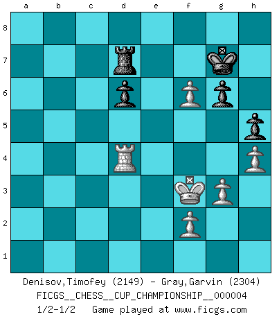 Last move : 1/2-1/2 2021 December 19 15:21:35 [Event "FICGS__CHESS__CUP_CHAMPIONSHIP__000004"] [Site "FICGS"] [Date "2021.09.20"] [Round "1"] [White "Denisov,Timofey"] [Black "Gray,Garvin"] [Result "1/2-1/2"] [WhiteElo "2149"] [BlackElo "2304"] 1.e4 c5 2.Nf3 d6 3.d4 cxd4 4.Nxd4 Nf6 5.Nc3 a6 6.Be3 e5 7.Nf3 Be7 8.Bc4 O-O 9.O-O Nc6 10.Qe2 Na5 11.Bd3 Be6 12.Na4 b5 13.Bb6 Qc8 14.Bxa5 bxa4 15.Rfe1 Bd8 16.Bxd8 Rxd8 17.Nd2 a5 18.Nc4 Qc5 19.b3 Qb4 20.Nb2 a3 21.Nc4 a4 22.Qf3 h6 23.h3 Rac8 24.Qe3 Nd7 25.Bf1 Bxc4 26.Bxc4 axb3 27.axb3 Nb6 28.Bd3 Rc3 29.Ra2 Nd7 30.Rea1 Nc5 31.Rxa3 Nxd3 32.cxd3 Qb8 33.h4 Rxb3 34.Ra5 Rb1+ 35.Rxb1 Qxb1+ 36.Kh2 Rb8 37.Rd5 Qb6 38.d4 Re8 39.Qd2 Qb7 40.Kg3 Re6 41.Kh2 Qe7 42.Kh3 Kh7 43.g3 g6 44.Qd3 Qb7 45.Rb5 Qa7 46.Rb4 Re7 47.Qc4 exd4 48.Qxd4 Qxd4 49.Rxd4 h5 50.Kg2 Kg7 51.Kf3 Rd7 52.e5 f6 53.exf6+ 1/2-1/2 Sicilian : Najdorf, Byrne (English) attack Kingside Castling by player Black (move 8) Kingside Castling by player White (move 9) This chess game ended in a draw. Follow this game move after move (download)Botvinnik tried to take the mystery out of Chess, always relating it to situations in ordinary life. He used to call Chess a typical inexact problem similar to those which people are always having to solve in everyday life. (Garry Kasparov) Im Fernschach kannst du während dem Spiel rauchen. (John Christen Knudsen) La partida mas dura de ganar es una partida ganada. (Emanuel Lasker) Les réformistes prétendent que les progrès de la théorie conduiront à la disparition des échecs, et qu'il faut, pour leur rendre vie, en remanier les règles. En réalité, qu'exprime cette affirmation? Le mépris de l'intuition, de l'imagination et de tous les autres éléments qui font des échecs un art. (Alexander Alekhine) Are you threatening me, Master Jedi ? (Chancellor Palpatine in Star Wars ep.3)
