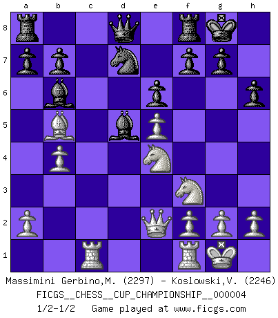 Last move : 1/2-1/2 2021 December 23 17:39:32 [Event "FICGS__CHESS__CUP_CHAMPIONSHIP__000004"] [Site "FICGS"] [Date "2021.09.20"] [Round "1"] [White "Massimini Gerbino,Massimiliano"] [Black "Koslowski,Volker"] [Result "1/2-1/2"] [WhiteElo "2297"] [BlackElo "2246"] 1.d4 Nf6 2.c4 e6 3.Nf3 d5 4.Nc3 dxc4 5.e4 Bb4 6.Bg5 h6 7.Bxf6 Qxf6 8.Bxc4 c5 9.O-O cxd4 10.e5 Qd8 11.Nxd4 O-O 12.Rc1 Bc5 13.Nf3 Bd7 14.Ne4 Bb6 15.Qe2 Bc6 16.b4 Nd7 17.Bb5 Bd5 18.Bc4 Bc6 19.Bb5 Bd5 1/2-1/2 Queen's pawn game Kingside Castling by player White (move 9) Kingside Castling by player Black (move 11) This chess game ended in a draw. Follow this game move after move (download)In Chess, at least, the brave inherit the earth. (Edmar Mednis) Je älter ich werde, um so mehr schätze ich die Bauern. (Paul Keres) El poder defensivo de una pieza clavada, solamente es imaginario. (Aaron Nimzovich) Les sacrifices démontrent seulement que quelqu'un a gaffé. (Savielly Tartacover) Fame, I have already. Now I need the money. (an elderly Steinitz)