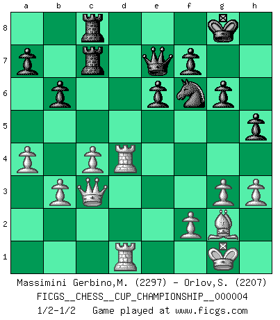 Last move : 1/2-1/2 2021 November 24 12:36:9 [Event "FICGS__CHESS__CUP_CHAMPIONSHIP__000004"] [Site "FICGS"] [Date "2021.09.20"] [Round "1"] [White "Massimini Gerbino,Massimiliano"] [Black "Orlov,Vladimir"] [Result "1/2-1/2"] [WhiteElo "2297"] [BlackElo "2207"] 1.d4 Nf6 2.c4 e6 3.Nf3 b6 4.g3 Ba6 5.b3 Bb4+ 6.Bd2 Be7 7.Bg2 c6 8.Bc3 d5 9.Nbd2 Nbd7 10.O-O O-O 11.Re1 c5 12.e4 dxe4 13.Nxe4 Nxe4 14.Rxe4 Bb7 15.Re2 Bf6 16.Rd2 Qe7 17.Qe2 Bxf3 18.Qxf3 cxd4 19.Bxd4 Bxd4 20.Rxd4 Nf6 21.Rad1 Rac8 22.Qe3 Rc7 23.a4 g6 24.Qc3 Rb8 25.h3 h6 26.Bf3 h5 27.Qd2 Rbc8 28.Bg2 Kg7 29.Qc3 Kg8 1/2-1/2 Queen's Indian : Nimzovich variation (exaggerated Fianchetto) Kingside Castling by player White (move 10) Kingside Castling by player Black (move 10) This chess game ended in a draw. Follow this game move after move (download)Not only will I predict his triumph over Botvinnik, but I'll go further and say that he'll probably be the greatest Chess player that ever lived. (John Collins) Wer der Ansicht ist, daß alle Schachspieler verrückt sind, wird durch Studium des Lebens von Emil Josef Diemer nicht auf andere Gedanken kommen. (Hans Ree) Buenas posiciones no logran ganar juegos, buenas movidas sí. (Gerald Abrahams) Que feriez-vous si vous étiez en train de jouer aux échecs et que la fin du monde arrive ? Je continuerais à jouer. (Saint Borromée) A good teacher is like a candle - it consumes itself to light the way for others. (Author unknown)