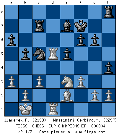 Last move : 1/2-1/2 2021 November 26 0:40:37 [Event "FICGS__CHESS__CUP_CHAMPIONSHIP__000004"] [Site "FICGS"] [Date "2021.09.20"] [Round "1"] [White "Wiaderek,Piotr"] [Black "Massimini Gerbino,Massimiliano"] [Result "1/2-1/2"] [WhiteElo "2193"] [BlackElo "2297"] 1.e4 c5 2.Nf3 d6 3.d4 cxd4 4.Nxd4 Nf6 5.Nc3 a6 6.Be3 e5 7.Nb3 Be6 8.Qd2 Nbd7 9.f3 h5 10.Nd5 Bxd5 11.exd5 g6 12.O-O-O Nb6 13.Kb1 Nfxd5 14.Bf2 Nf6 15.Bh4 Be7 16.Bxf6 Bxf6 17.Qxd6 Qxd6 18.Rxd6 Bd8 19.Rd2 h4 20.Be2 Rc8 21.Re1 Bg5 22.Rd6 Nd7 23.Red1 Rc7 24.Nd2 Be7 25.Rd5 f6 26.Nc4 Nc5 27.c3 Kf7 28.a3 b5 29.Ne3 1/2-1/2 Sicilian : Najdorf, Byrne (English) attack Queenside Castling by player White (move 12) This chess game ended in a draw. Follow this game move after move (download)In a gambit you give up a Pawn for the sake of getting a lost game. (Samuel Standige Boden) Je mehr ich von der FIDE weiss, um so weniger verstehe ich. (Alexander Kalifman) De eso se trata el Ajedrez. Un día le das una lección a tu oponente y al día siguiente el te da una a tí. (Bobby Fischer) Demandez au pauvre Cg1 ce qu'il en pense. Eduard Gufeld à propos de la variante Saemisch de l'Est-Indienne. Every now and then a man's mind is stretched by a new idea and never shrinks back to its former dimensions. (Oliver Wendell Holmes, Sr.)