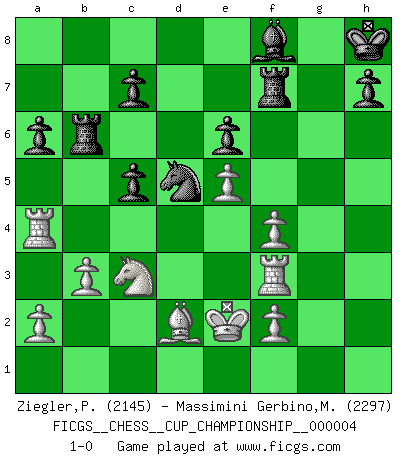 Last move : 1-0 2021 November 22 2:19:2 [Event "FICGS__CHESS__CUP_CHAMPIONSHIP__000004"] [Site "FICGS"] [Date "2021.09.20"] [Round "1"] [White "Ziegler,Pio"] [Black "Massimini Gerbino,Massimiliano"] [Result "1-0"] [WhiteElo "2145"] [BlackElo "2297"] 1.d4 d5 2.c4 Nf6 3.cxd5 Nxd5 4.Nf3 g6 5.e4 Nb6 6.h3 Bg7 7.Nc3 O-O 8.Be2 f5 9.e5 Nc6 10.h4 f4 11.h5 gxh5 12.Rxh5 Bg4 13.Rh4 Bxf3 14.Bxf3 e6 15.g3 Qxd4 16.Bxc6 Qxd1+ 17.Nxd1 bxc6 18.gxf4 Nd5 19.Bd2 Rab8 20.Rc1 Rf7 21.Rc4 Bf8 22.Ke2 Rb6 23.Ra4 Be7 24.Rh6 c5 25.Rh3 Kh8 26.Rf3 a6 27.b3 Bf8 28.Nc3 1-0 QGD : Marshall defense Kingside Castling by player Black (move 7) Player White won this chess game. Follow this game move after move (download)Don't even mention losing to me. I can't stand to think of it. (Bobby Fischer) Ich glaube, ich kenne inzwischen die Gründe für mein Versagen: schachliche Charakterfehler. Ich war nie ein Wunderkind und in meiner gesamten menschlichen Entwicklung immer zu langsam. (Viktor Kortschnoi) Si no le temes a Spassky, entonces elimino el elemento del dinero. (Jim Slater) Le profane ne songe pas à la somme de jouissance dont il se prive, qui méconnaît ce jeu aux ressources aussi variées que passionnantes. (Jean-Marie Jeanton-Lamarche) Being number two sucks. (Andre Agassi)