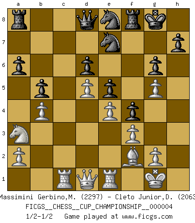 Last move : 1/2-1/2 2021 December 6 3:18:15 [Event "FICGS__CHESS__CUP_CHAMPIONSHIP__000004"] [Site "FICGS"] [Date "2021.09.20"] [Round "1"] [White "Massimini Gerbino,Massimiliano"] [Black "Cleto Junior,Dirceu"] [Result "1/2-1/2"] [WhiteElo "2297"] [BlackElo "2063"] 1.d4 Nf6 2.c4 d6 3.Nf3 g6 4.Nc3 Bg7 5.e4 O-O 6.Be2 e5 7.O-O Nc6 8.d5 Ne7 9.b4 Nh5 10.Re1 f5 11.Ng5 Nf6 12.f3 c6 13.Be3 Bh6 14.h4 cxd5 15.cxd5 Bd7 16.Rc1 f4 17.Bf2 Bxg5 18.hxg5 Ne8 19.Bb5 Bxb5 20.Nxb5 a6 21.Na3 b5 1/2-1/2 Old Indian defense Kingside Castling by player Black (move 5) Kingside Castling by player White (move 7) This chess game ended in a draw. Follow this game move after move (download)The tactician knows what to do when there is something to do; whereas the strategian knows what to do when there is nothing to do. (Gerald Abrahams) Das Schachspiel übertrifft alle anderen Spiele so weit wie der Chimborasso einen Misthaufen. (Arthur Schopenhauer) Un sacrificio se refuta mucho mejor al aceptarlo. (Wilhelm Steinitz) Ne tendez aucun piège pour le plaisir ! Ne jouez rien dans l'espoir que l'adversaire réagisse de façon stupide ! Prenez toujours pour acquis que l'adversaire va trouver le meilleur coup ! Ne jouez jamais de coup dans l'espoir que l'adversaire ne voie pas la menace ! Chacun de vos coups doit améliorer la position d'une façon ou d'une autre. You must have a dream in order to have it come true. (A.P.J. Kalam)