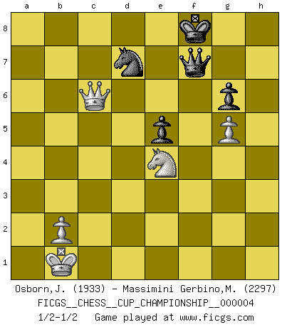 Last move : 1/2-1/2 2021 November 29 10:43:12 [Event "FICGS__CHESS__CUP_CHAMPIONSHIP__000004"] [Site "FICGS"] [Date "2021.09.20"] [Round "1"] [White "Osborn,John"] [Black "Massimini Gerbino,Massimiliano"] [Result "1/2-1/2"] [WhiteElo "1933"] [BlackElo "2297"] 1.e4 c5 2.Nf3 d6 3.Nc3 Nf6 4.d4 cxd4 5.Nxd4 a6 6.Be3 e5 7.Nb3 Be6 8.f3 Be7 9.Qd2 O-O 10.O-O-O Nbd7 11.g4 b5 12.g5 b4 13.Ne2 Ne8 14.f4 a5 15.f5 a4 16.fxe6 axb3 17.cxb3 fxe6 18.Bh3 Rxa2 19.Bxe6+ Kh8 20.Ng3 Nc7 21.Bc4 Qa8 22.Rhf1 Rxf1 23.Rxf1 Ra1+ 24.Kc2 Rxf1 25.Bxf1 d5 26.Qf2 g6 27.h4 dxe4 28.Qf7 Qf8 29.Qc4 Bc5 30.Kb1 Qg8 31.Qc2 Ne6 32.Qxe4 Bxe3 33.Qxe3 Qf7 34.Qd2 Nd4 35.Qxb4 Nxb3 36.Qc3 Kg7 37.Bh3 Nbc5 38.Bxd7 Nxd7 39.Qc6 h6 40.Ne4 hxg5 41.hxg5 Kf8 1/2-1/2 Sicilian Kingside Castling by player Black (move 9) Queenside Castling by player White (move 10) 10 pieces endgame at move 41 : White KQNPP , Black KQNPP WHITE : King + 1 Queen 1 Knight 2 Pawns BLACK : King + 1 Queen 1 Knight 2 Pawns This chess game ended in a draw. Follow this game move after move (download)Every Pawn is a potential Queen. (James Mason) Schon mancher Spieler hat aufgegeben, um zu vermeiden, daß er eine Figur verliert. (Savielly Grigorievitsch Tartakower) Yo jugué Ajedrez con el y a veces le pude haber ganado solo que siempre devuelve su última jugada y juega la partida de manera diferente. (Mark Twain) 'L'échange des dames est un coup dur pour les deux adversaires...' Un journaliste lors d'une partie du match Spassky-Fischer May I never be complete. May I never be content. May I never be perfect. Deliver me, Tyler, from being perfect and complete. (Chuck Palahniuk, Fight Club)