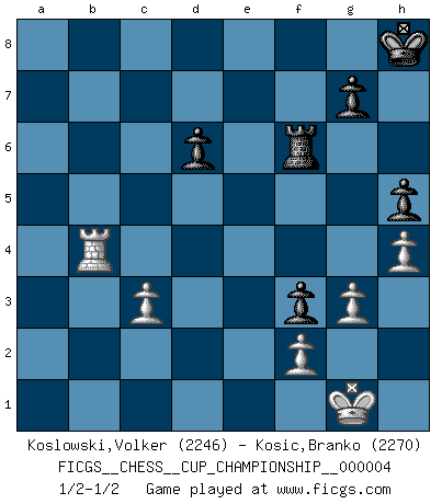 Last move : 1/2-1/2 2022 April 12 13:11:43 [Event "FICGS__CHESS__CUP_CHAMPIONSHIP__000004"] [Site "FICGS"] [Date "2021.09.20"] [Round "1"] [White "Koslowski,Volker"] [Black "Kosic,Branko"] [Result "1/2-1/2"] [WhiteElo "2246"] [BlackElo "2270"] 1.e4 c5 2.Nf3 Nc6 3.d4 cxd4 4.Nxd4 Nf6 5.Nc3 e5 6.Ndb5 d6 7.Bg5 a6 8.Na3 b5 9.Nd5 Be7 10.Bxf6 Bxf6 11.c3 O-O 12.Nc2 Bg5 13.a4 bxa4 14.Rxa4 a5 15.Bc4 Bd7 16.O-O Nb4 17.Ra3 Nxd5 18.Bxd5 Rb8 19.b4 axb4 20.Nxb4 Qc8 21.Qf3 Kh8 22.Ra7 h6 23.h3 Be6 24.Rfa1 f5 25.Qg3 Bg8 26.exf5 Qxf5 27.h4 Bf6 28.Bxg8 Rxg8 29.Nd5 Rb1+ 30.Rxb1 Qxb1+ 31.Kh2 Qf5 32.Ra4 Rf8 33.Rg4 h5 34.Rb4 e4 35.Nxf6 Rxf6 36.Kg1 Rg6 37.Qe3 Qf3 38.Qxf3 exf3 39.g3 Rf6 1/2-1/2 Sicilian : Pelikan (Lasker/Sveshnikov) variation Kingside Castling by player Black (move 11) Kingside Castling by player White (move 16) This chess game ended in a draw. Follow this game move after move (download)By this measure (on the gap between Fischer & his contemporaries), I consider him the greatest world champion. (Garry Kasparov) Wer mein Gambit spielt, muß bereit sein, alle Brücken hinter sich abzubrechen. Es verändert den ganzen Menschen. Es wirkt wie ein Zauberstab und fördert verkümmerte, gute Charakter- eigenschaften wieder zu Tage. (Emil Joseph Diemer) Cualquier cambio de material en una posición debe venir por medio de un mate, una captura o promoción de Peón. (Purdy) À la honte des hommes, on sait que les lois du jeu sont les seules qui soient partout justes, claires, inviolables et exécutées. Pourquoi l'Indien qui a donné les règles du jeu d'échecs est-il obéi de bon gré dans toute la terre, et que les décrétales des papes, par exemple, sont aujourd'hui un objet d'horreur et de mépris ? C'est que l'inventeur des échecs combina tout avec justesse pour la satisfaction des joueurs, et que les papes, dans leurs décrétales, n'eurent en vue que leur seul avantage. L'Indien voulut exercer également l'esprit des hommes et leur donner du plaisir; les papes ont voulu abrutir l'esprit des hommes. Voltaire (Dictionnaire philosophique / Garnier 1967) All the troubles of the world come from being unable to sit alone in a quiet room. (Blaise Pascal)