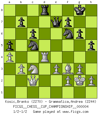 Last move : 1/2-1/2 2022 March 1 12:14:52 [Event "FICGS__CHESS__CUP_CHAMPIONSHIP__000004"] [Site "FICGS"] [Date "2021.09.20"] [Round "1"] [White "Kosic,Branko"] [Black "Grammatica,Andrea"] [Result "1/2-1/2"] [WhiteElo "2270"] [BlackElo "2244"] 1.c4 e5 2.Nc3 Bb4 3.Nd5 Bc5 4.Nf3 c6 5.Nc3 d6 6.e3 Qe7 7.d4 exd4 8.Nxd4 Nf6 9.Be2 O-O 10.O-O d5 11.b3 dxc4 12.Bxc4 Nbd7 13.Nf5 Qe5 14.Qc2 Nb6 15.Bd3 Bxf5 16.Bxf5 Bd6 17.g3 Rfe8 18.Bb2 Qc5 19.a4 g6 20.Bd3 a5 21.Rfd1 Be5 22.Rac1 Rad8 23.Kg2 Qb4 24.Be2 h5 25.Na2 Qe7 26.Bc3 Bxc3 27.Nxc3 Rd7 28.Rxd7 Nbxd7 29.Rd1 Rd8 30.Qd2 Re8 31.Qc2 Nc5 32.Bf3 Rd8 33.Rd4 1/2-1/2 English, Kramnik-Shirov counterattack Kingside Castling by player Black (move 9) Kingside Castling by player White (move 10) This chess game ended in a draw. Follow this game move after move (download)The only thing Chess players have in common is Chess. (Lodewijk Prins) Ich bin Weltmeister und muß mit niemandem irgend etwas diskutieren. (Viswanathan Anand) Por la belleza de sus partidas, la claridad de su juego y lo brillante de sus ideas, Fischer se creó el mismo como un artista de la misma estatura como Brahms, Rembrandt y Shakespeare. (David Levy) Les Echecs ne sont pas pour les âmes timides. Ils requièrent un homme entier, qui ne s'arrête pas aveuglément à ce qui a été déjà établi, mais qui tente individuellement de sonder les profondeurs du jeu. (W. Steinitz) Life is like internet, nothing interesting, but noone want to leave it. (Ilmars Cirulis)