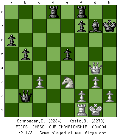 Last move : 1/2-1/2 2022 January 17 16:45:51 [Event "FICGS__CHESS__CUP_CHAMPIONSHIP__000004"] [Site "FICGS"] [Date "2021.09.20"] [Round "1"] [White "Schroeder,Christoph"] [Black "Kosic,Branko"] [Result "1/2-1/2"] [WhiteElo "2234"] [BlackElo "2270"] 1.e4 c5 2.Nf3 Nc6 3.d4 cxd4 4.Nxd4 Nf6 5.Nc3 e5 6.Ndb5 d6 7.Bg5 a6 8.Na3 b5 9.Bxf6 gxf6 10.Nd5 f5 11.g3 Bg7 12.Bg2 fxe4 13.Bxe4 Be6 14.Qh5 Rc8 15.O-O Ne7 16.Nxe7 Qxe7 17.Rad1 Qd7 18.c3 Bg4 19.Qg5 O-O 20.Rxd6 Qxd6 21.Qxg4 Rcd8 22.Nc2 Qe6 23.Bf5 Qxa2 24.Ne3 Qxb2 25.Bxh7+ Kxh7 1/2-1/2 Sicilian : Pelikan (Lasker/Sveshnikov) variation Kingside Castling by player White (move 15) Kingside Castling by player Black (move 19) This chess game ended in a draw. Follow this game move after move (download)You can only get good at Chess if you love the game. (Bobby Fischer) Offener Brief an US-Präsident Bush anlässlich der Verhaftung Bobby Fishers: Verhaften Sie mich. Stecken Sie mich in dieselbe Zelle wie Bobby Fisher und geben Sie uns ein Schachspiel mit. (Boris Vassilievich Spassky) En manos de Fischer's, una diminuta ventaja teórica es tan buena como tener una Reina de ventaja. (Isaac Kashdan) Votre prénom est 'Tactique', votre deuxième prénom est 'Tactique' et votre nom est 'Tactique'. (Ken Smith) Art is the only way to run away without leaving home. (Twyla Tharp)