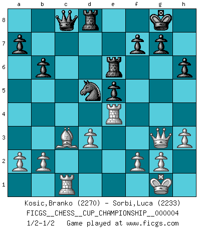 Last move : 1/2-1/2 2022 February 17 0:17:57 [Event "FICGS__CHESS__CUP_CHAMPIONSHIP__000004"] [Site "FICGS"] [Date "2021.09.20"] [Round "1"] [White "Kosic,Branko"] [Black "Sorbi,Luca"] [Result "1/2-1/2"] [WhiteElo "2270"] [BlackElo "2233"] 1.c4 e5 2.Nc3 Nf6 3.Nf3 Nc6 4.e4 Bb4 5.d3 d6 6.Be2 Bc5 7.Be3 O-O 8.O-O Bg4 9.Nd2 Bxe2 10.Qxe2 Nd4 11.Qd1 Re8 12.h3 c6 13.Nf3 Nxf3+ 14.Qxf3 Re6 15.Ne2 Qb6 16.Bc1 Rd8 17.Nc3 Bd4 18.Ne2 Bc5 19.Nc3 h6 20.Na4 Qc7 21.Bd2 Bd4 22.Rac1 Qb8 23.Nc3 d5 24.cxd5 cxd5 25.exd5 Bxc3 26.Bxc3 Nxd5 27.Rfe1 b6 28.Re4 Qc8 29.Qg3 Rg6 30.Qf3 Re6 31.Qg3 1/2-1/2 English Opening Kingside Castling by player Black (move 7) Kingside Castling by player White (move 8) This chess game ended in a draw. Follow this game move after move (download)He who takes the Queen's Knight's Pawn will sleep in the streets. (Anonymous) Im Fernschach kannst du während dem Spiel rauchen. (John Christen Knudsen) Bobby solo arroja las piezas y solas caen en las casillas correctas. (Miguel Najdorf ) Des combinaisons [dans le jeu d'échecs] pareilles à des mélodies. Je crois entendre pour ainsi dire la musique des coups... (Vladimir Nabokov) Big Chess is a place for big hallucinations. (Thibault de Vassal)