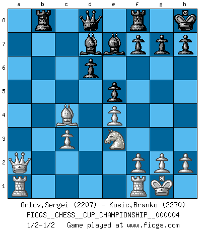 Last move : 1/2-1/2 2022 January 2 15:41:24 [Event "FICGS__CHESS__CUP_CHAMPIONSHIP__000004"] [Site "FICGS"] [Date "2021.09.20"] [Round "1"] [White "Orlov,Vladimir"] [Black "Kosic,Branko"] [Result "1/2-1/2"] [WhiteElo "2207"] [BlackElo "2270"] 1.e4 c5 2.Nf3 Nc6 3.d4 cxd4 4.Nxd4 Nf6 5.Nc3 e5 6.Ndb5 d6 7.Bg5 a6 8.Na3 b5 9.Nd5 Be7 10.Bxf6 Bxf6 11.c3 O-O 12.Nc2 Bg5 13.a4 bxa4 14.Rxa4 a5 15.Bc4 Bd7 16.O-O Kh8 17.Nce3 Ne7 18.Ra1 a4 19.Nxe7 Bxe7 20.b3 axb3 21.Qxb3 Rb8 22.Qa2 1/2-1/2 Sicilian : Pelikan (Lasker/Sveshnikov) variation Kingside Castling by player Black (move 11) Kingside Castling by player White (move 16) This chess game ended in a draw. Follow this game move after move (download)Every Chess master was once a beginner. (Chernev) Sie bekommen vielleicht den Eindruck, dass die Spitzenspieler überhaupt gar nicht so stark sind. Aber das stimmt nicht. Es ist eine Illusion. Mit einem Computer an der Seite ist es sehr leicht, Urteile zu fällen, aber wenn man alleine am Brett sitzt, sieht die Sache ganz anders aus. (Vladimir Kramnik) Solo existe una cosa que Fischer hace en el Ajedrez sin placer: ¡perder!. (Boris Spassky) Mais n'est-ce pas déjà le limiter injurieusement que d'appeler les échecs un jeu? N'est-ce pas aussi une science, un art, ou quelque chose qui, comme le cercueil de Mahomet entre ciel et terre, est suspendu entre l'un et l'autre, et qui réunit un nombre incroyable de contraires ? (Stefan Zweig) But they are useless. They can only give you answers. (Pablo Picasso, about computers)