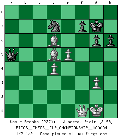 Last move : 1/2-1/2 2022 March 11 4:32:18 [Event "FICGS__CHESS__CUP_CHAMPIONSHIP__000004"] [Site "FICGS"] [Date "2021.09.20"] [Round "1"] [White "Kosic,Branko"] [Black "Wiaderek,Piotr"] [Result "1/2-1/2"] [WhiteElo "2270"] [BlackElo "2193"] 1.c4 Nf6 2.Nc3 e5 3.Nf3 Nc6 4.e4 Bb4 5.d3 d6 6.a3 Bxc3+ 7.bxc3 O-O 8.g3 Na5 9.Bg2 Re8 10.O-O c6 11.Rb1 Bd7 12.Nh4 b5 13.cxb5 cxb5 14.h3 Rb8 15.Be3 a6 16.Qd2 Be6 17.c4 Nd7 18.cxb5 axb5 19.f4 exf4 20.Bxf4 Nb3 21.Qe3 Nf8 22.Nf3 Ra8 23.Nd4 Nxd4 24.Qxd4 Rxa3 25.Rxb5 Qd7 26.Rfb1 Bxh3 27.Rb7 Qe6 28.Bxd6 Ra2 29.Bf3 h6 30.Rb8 Nd7 31.Rxe8+ Qxe8 32.e5 Be6 33.Qc3 Qd8 34.Be4 g6 35.Qc1 Kh7 36.Bc7 Qe7 37.d4 Ra3 38.Qf4 Ra4 39.Bc6 Rc4 40.Bd6 Qd8 41.Bg2 Qa5 42.Rc1 Rxc1+ 43.Qxc1 Bd5 44.Qf1 Kg7 45.Bxd5 1/2-1/2 English Opening Kingside Castling by player Black (move 7) Kingside Castling by player White (move 10) This chess game ended in a draw. Follow this game move after move (download)You cannot play at Chess if you are kind-hearted. (French Proverb) Ich liebe den Moment, wenn ich das Ego meines Gegenüber breche. (Robert James Fischer) El Ajedrez es de 30 a 40 por ciento psicología. Uno no cuenta con esto cuando se juega contra una computadora. No lo puedo confundir. (Judith Polgar) Que feriez-vous si vous étiez en train de jouer aux échecs et que la fin du monde arrive ? Je continuerais à jouer. (Saint Borromée) He who laughs last probably does not get the joke. (Unknown)