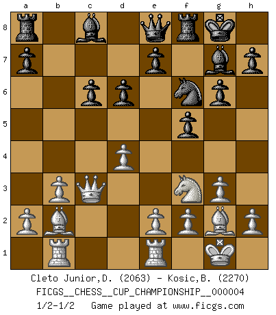 Last move : 1/2-1/2 2022 February 1 17:35:36 [Event "FICGS__CHESS__CUP_CHAMPIONSHIP__000004"] [Site "FICGS"] [Date "2021.09.20"] [Round "1"] [White "Cleto Junior,Dirceu"] [Black "Kosic,Branko"] [Result "1/2-1/2"] [WhiteElo "2063"] [BlackElo "2270"] 1.d4 f5 2.g3 Nf6 3.Bg2 g6 4.c4 Bg7 5.Nf3 O-O 6.O-O d6 7.Nc3 c6 8.Qc2 Na6 9.Rb1 Nc7 10.b3 Qe8 11.Re1 b5 12.cxb5 Nxb5 13.Bb2 Nxc3 14.Qxc3 1/2-1/2 Dutch defense Kingside Castling by player Black (move 5) Kingside Castling by player White (move 6) This chess game ended in a draw. Follow this game move after move (download)Bobby Fischer is the greatest Chess genius of all time ! (Alexander Kotov) Ein Teil des Fehlers ist immer korrekt. (Savielly Grigorievitsch Tartakower) El Ajedrez moderno está demasiado preocupado con cosas como la estructura de Peones. Olvidenlo, el Jaque Mate termina la partida. (Nigel Short) Donnez-moi un Cavalier en 6e et je gagnerais toutes mes parties. (Steinitz) It is not titles that honor men, but men that honor titles. (Niccolo Machiavelli)